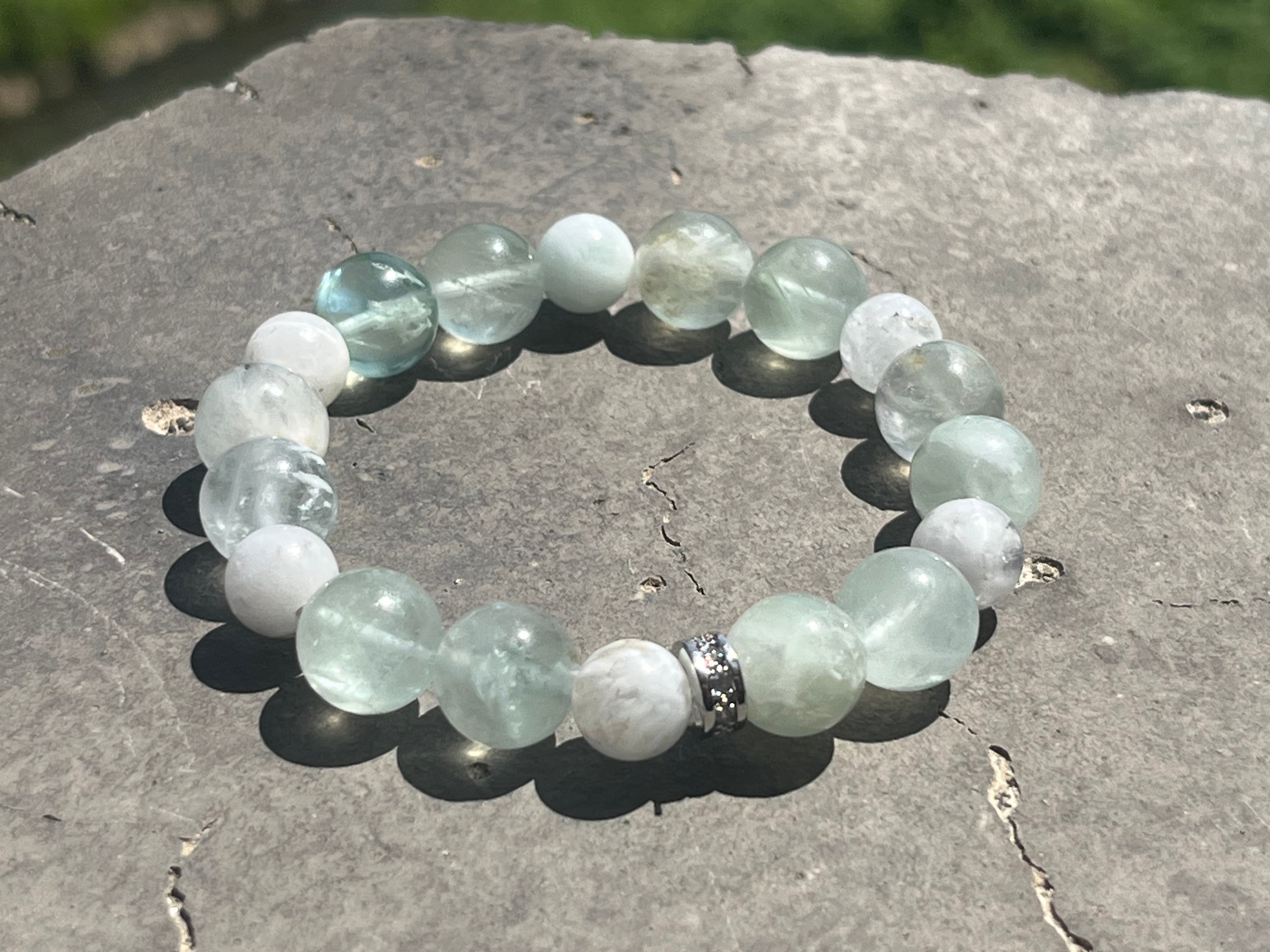 美しさと神秘を兼ね備えた、グリーンとホワイトのエンジェルフェザーフローライトを使用した素敵なブレスレットです。フローライトはその透明感と優しい色合いが特徴で、見る人を魅了します。このブレスレットは、心のバランスを整えると言われる力強いストーンです。