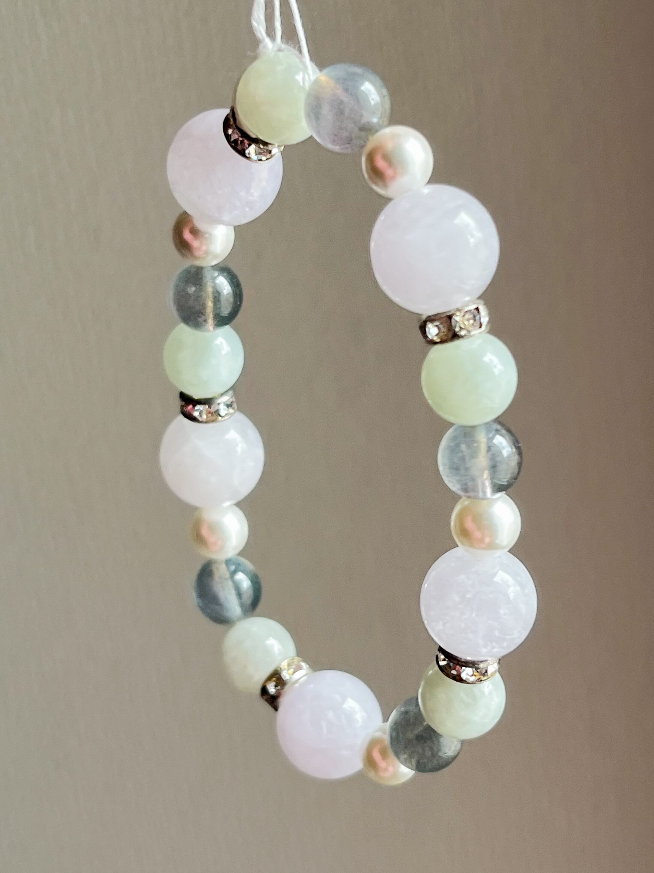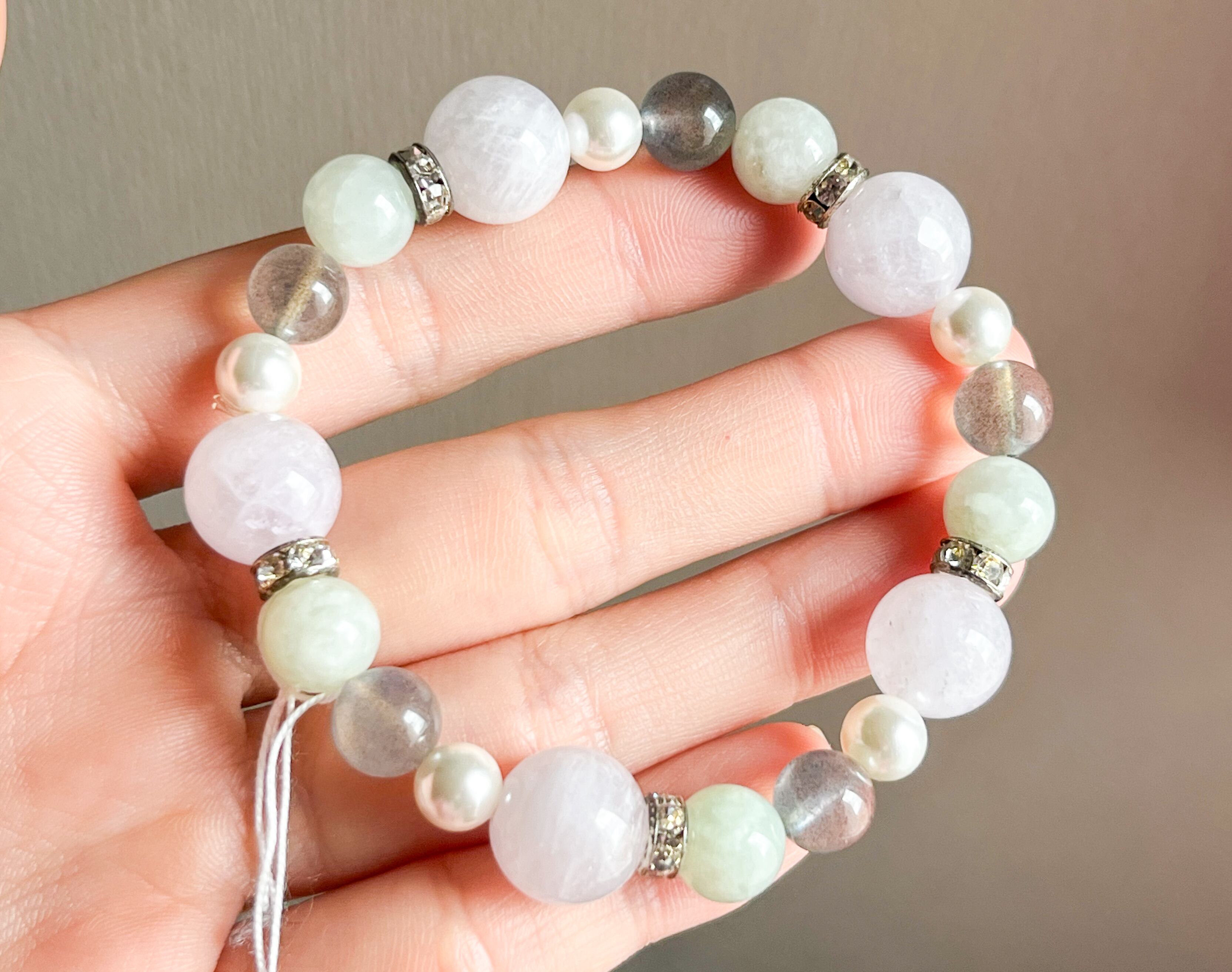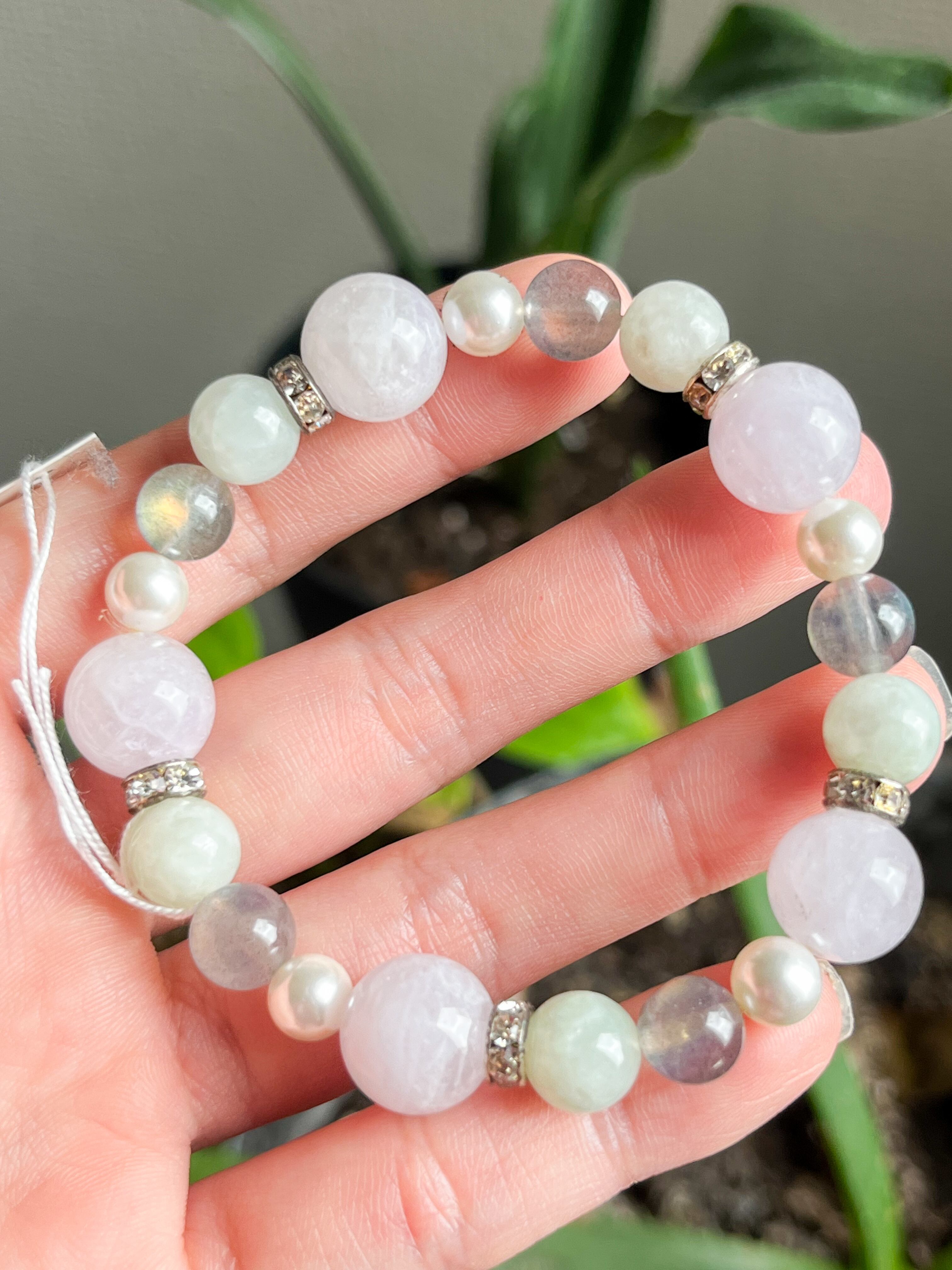 ラベンダーアメジストと翡翠、ラブラドライト、パールのブレスレットです。
