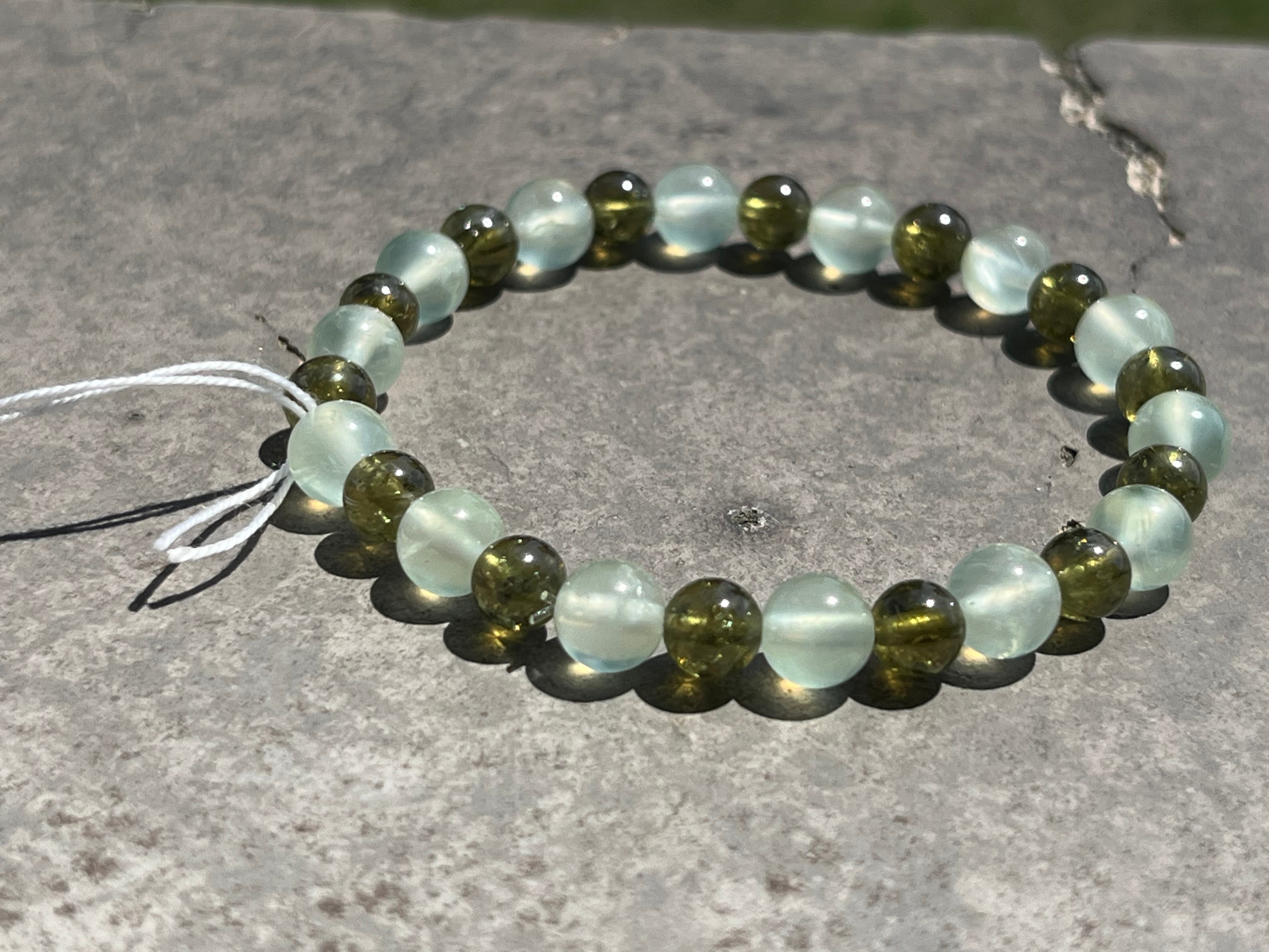 グリーンの色合いが美しい、プレナイトとツァボライトの癒しのブレスレットです。