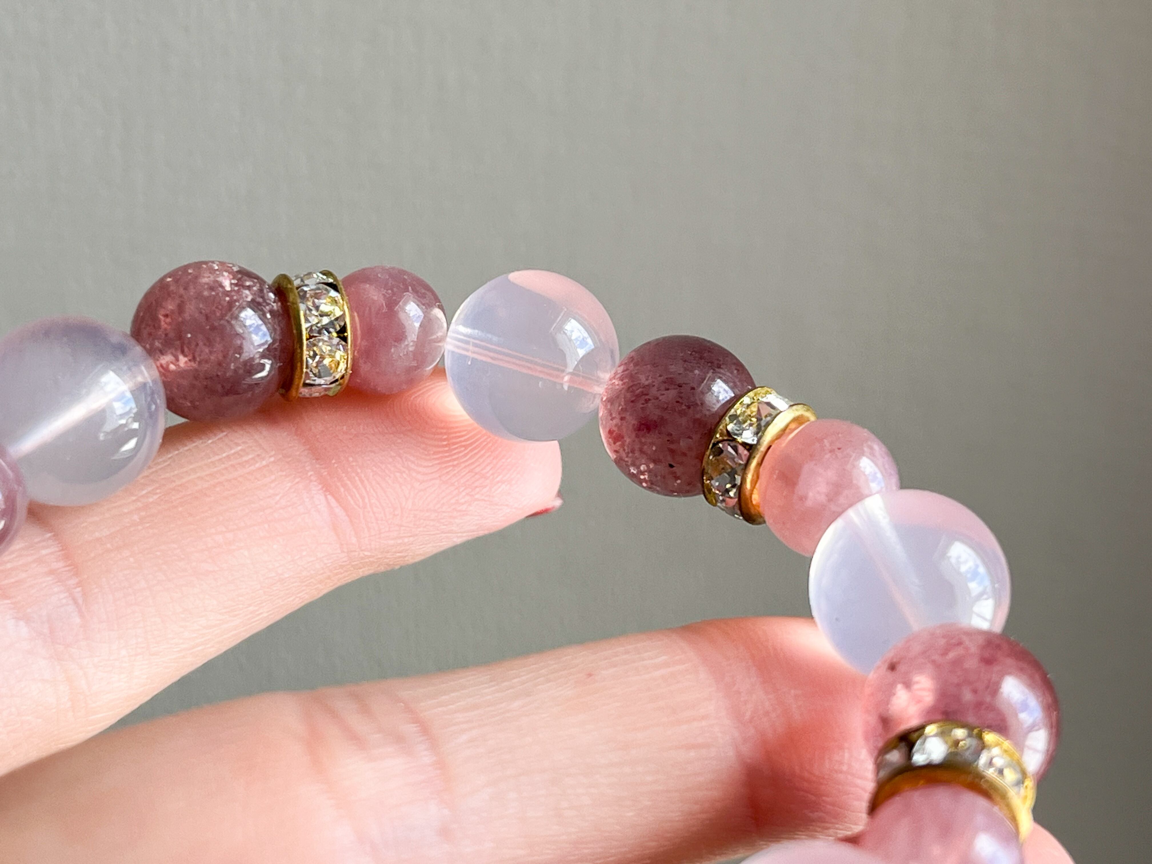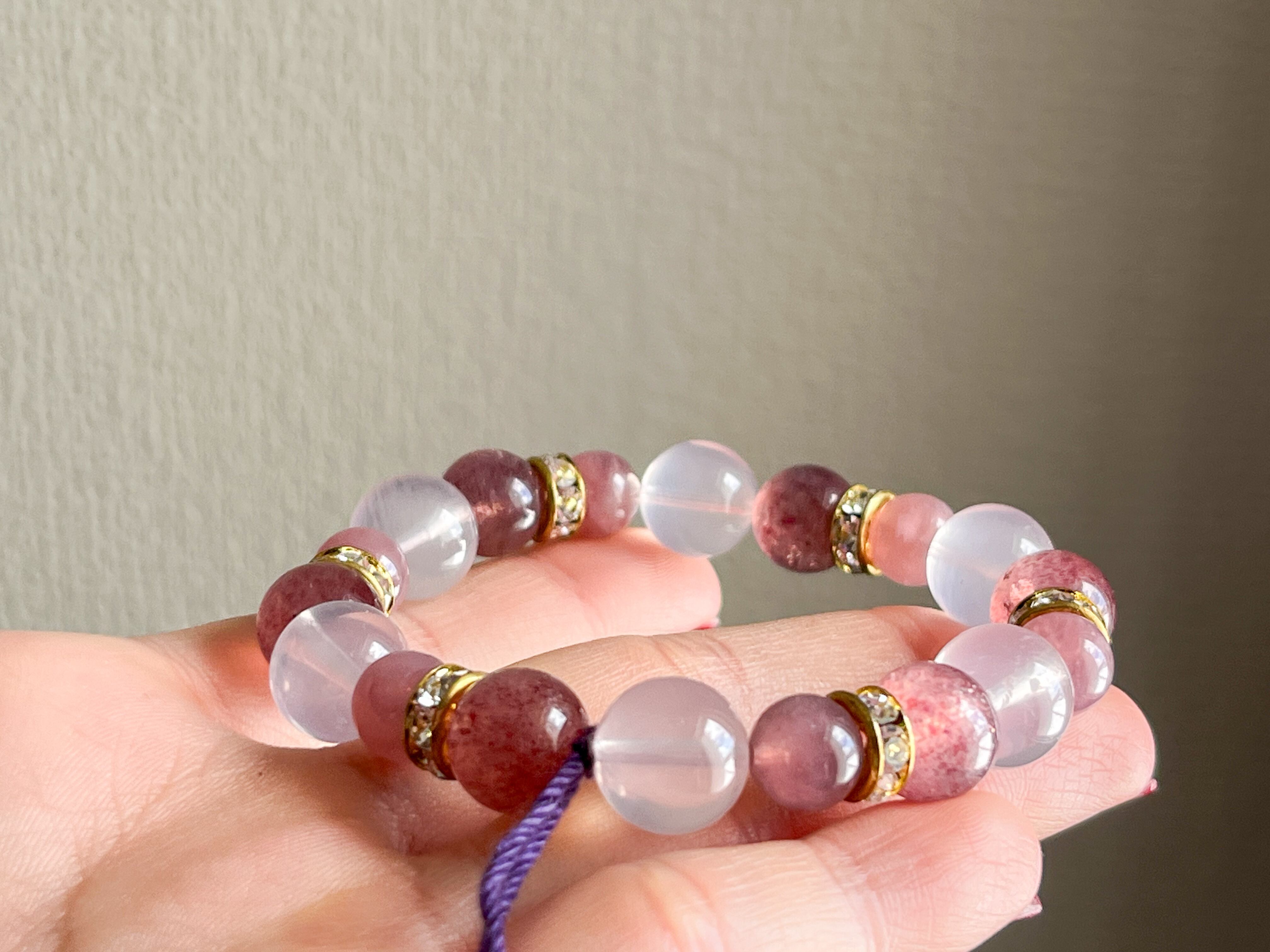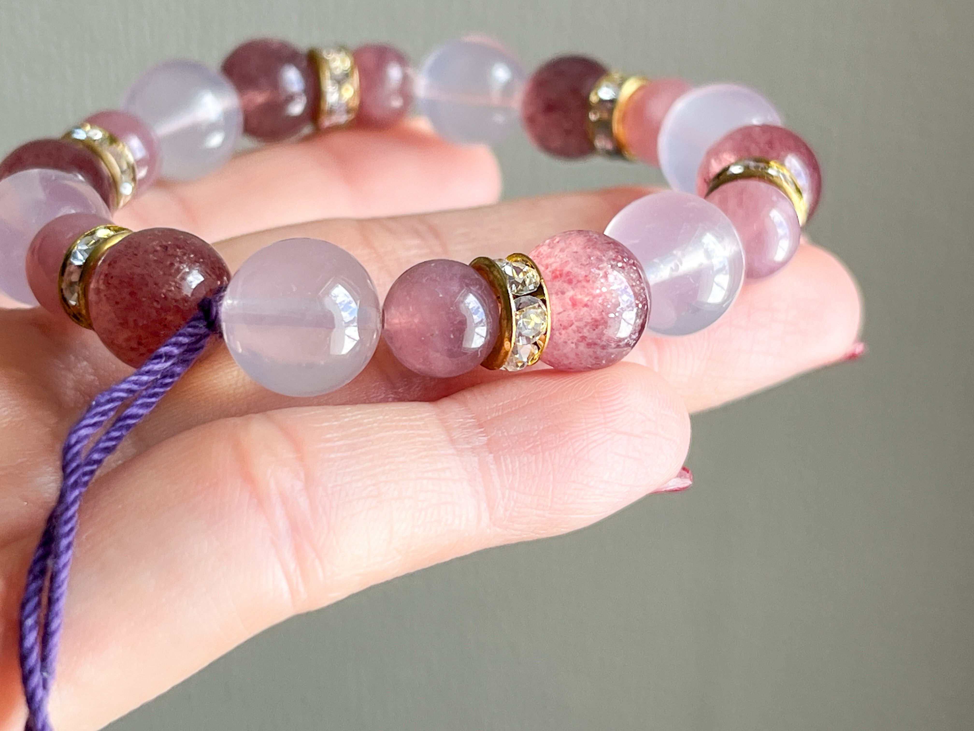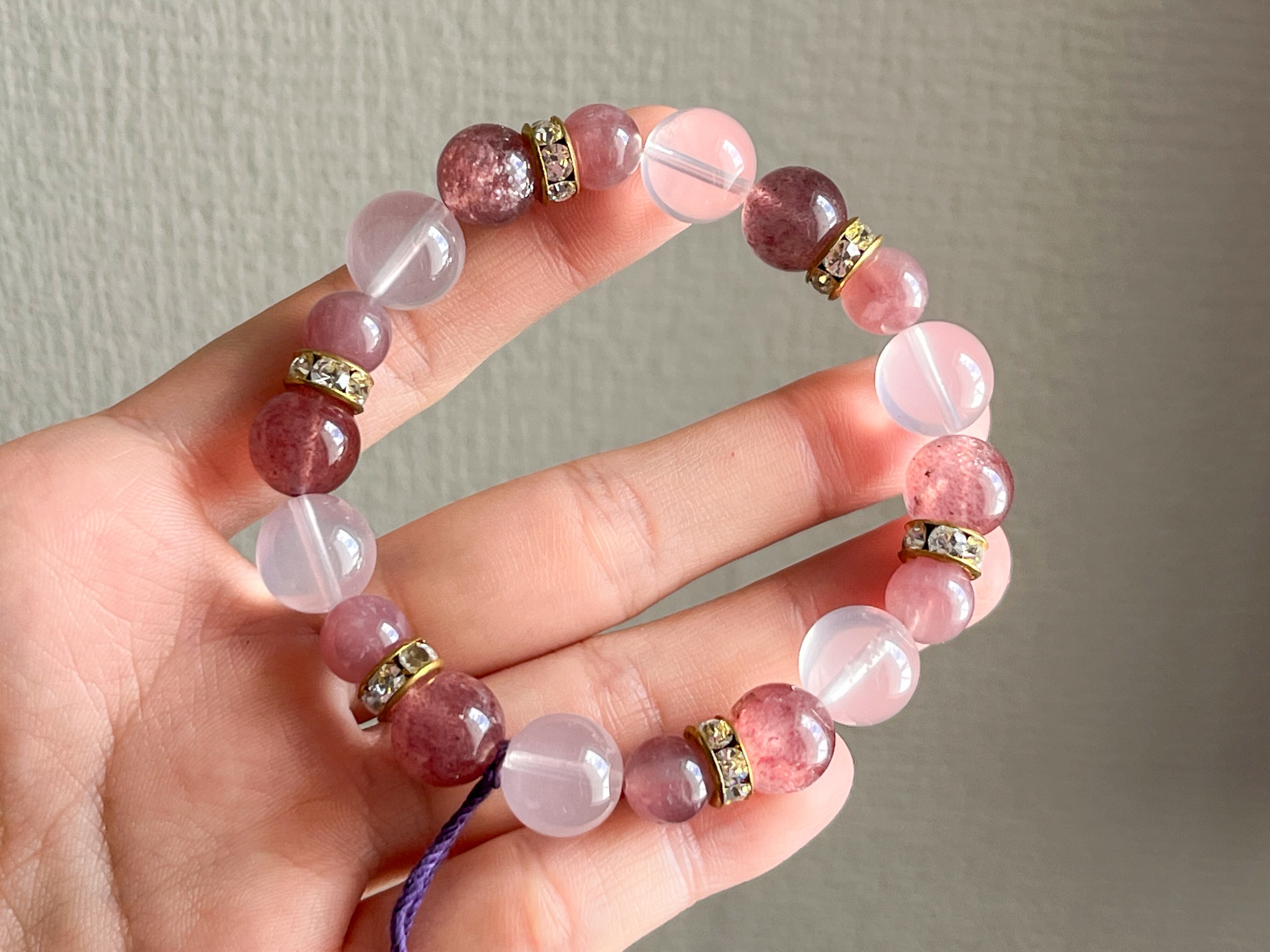 ローズクォーツ、ラズベリークォーツ、ストロベリークォーツのベリー感たっぷりの可愛らしいブレスレットです。