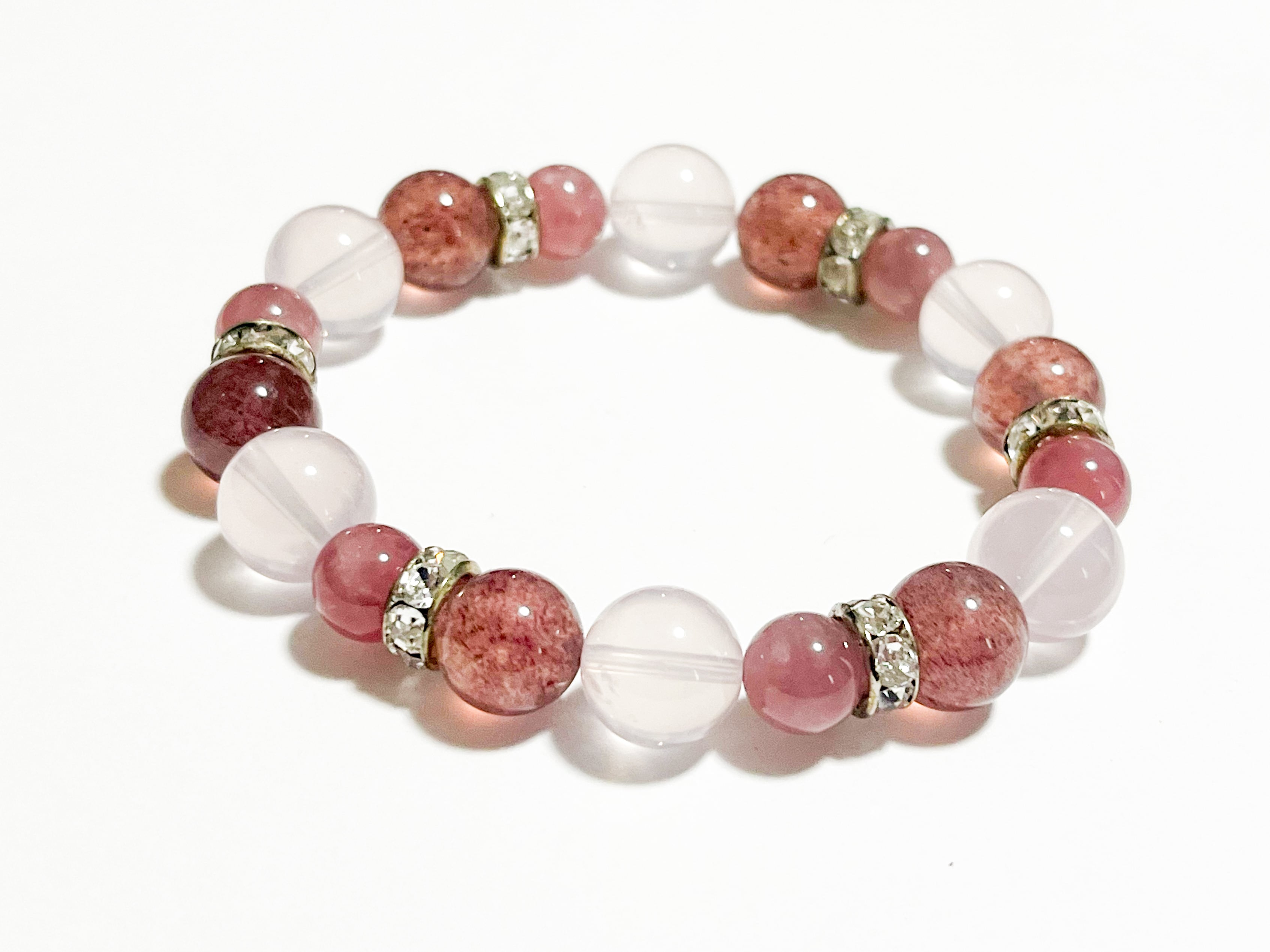 ローズクォーツ、ラズベリークォーツ、ストロベリークォーツのベリー感たっぷりの可愛らしいブレスレットです。
