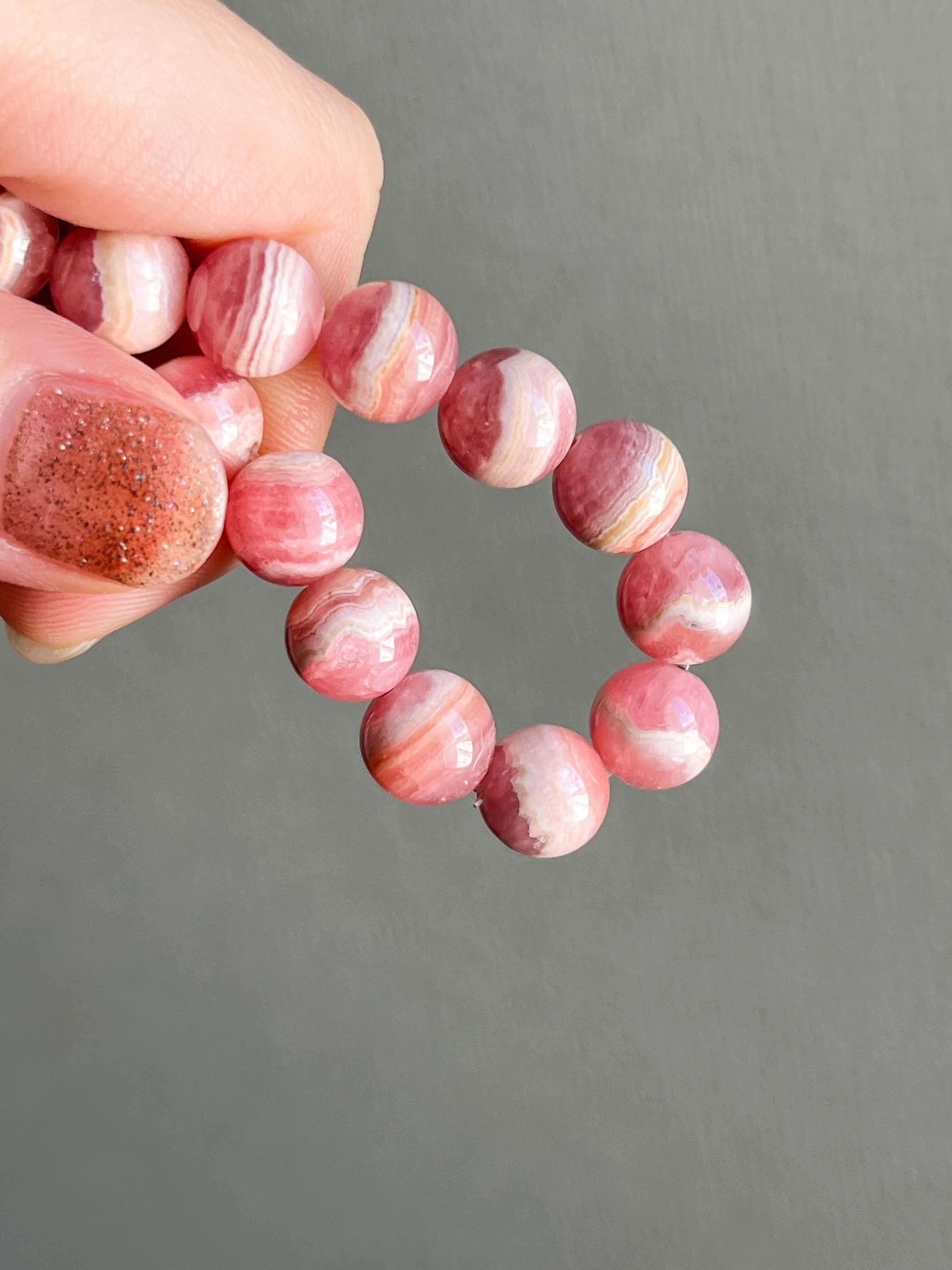 ペルー産のインカローズを使用したブレスレットです。独特なピンク色と可愛らしい縞模様が特徴で、装着するだけで華やかな印象に仕上げます。手首を飾るだけでなく、心まで温かく包んでくれるパワーストーンとしても人気です。