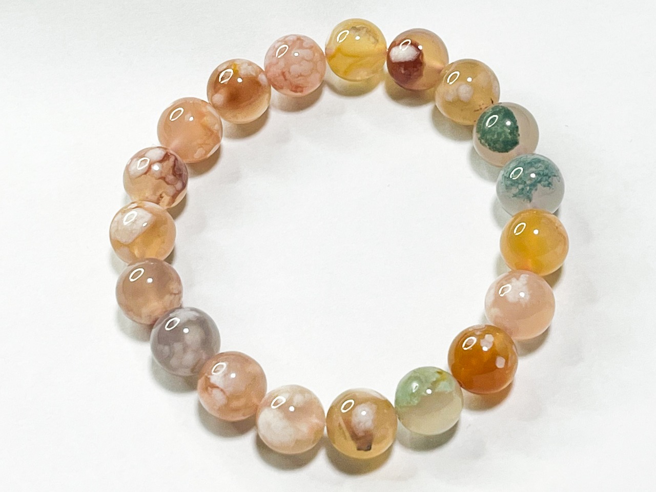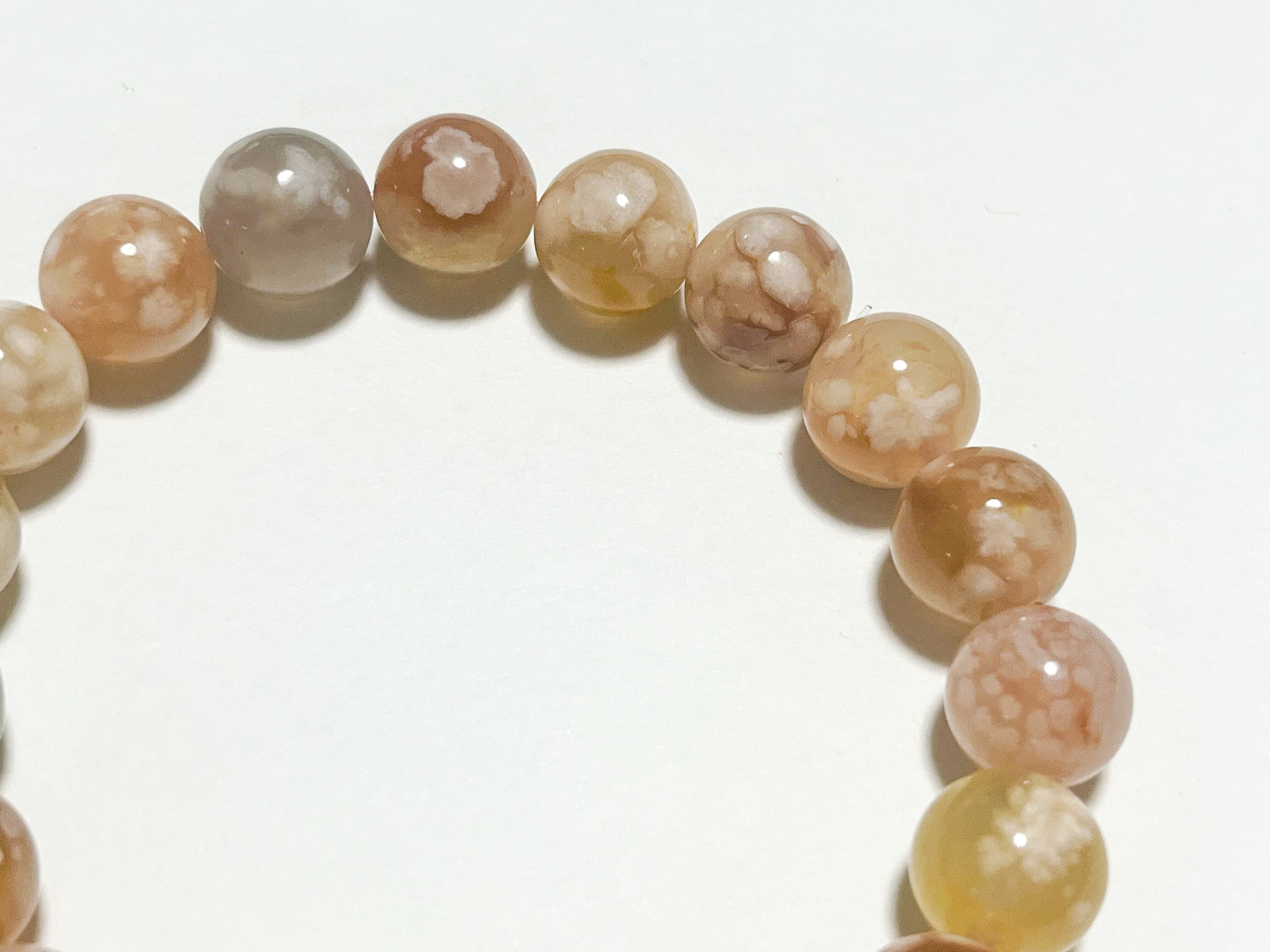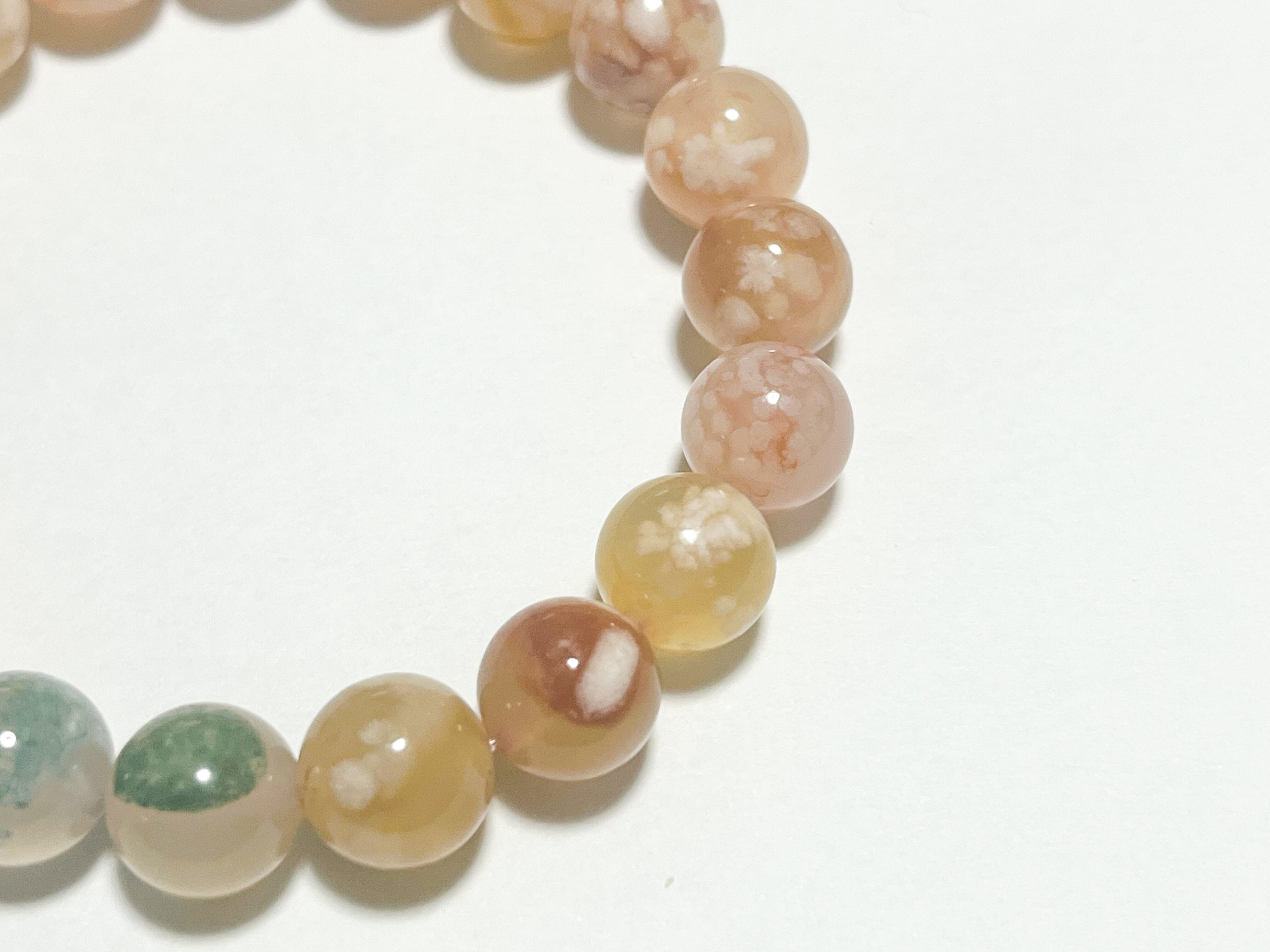 桜瑪瑙ブレスレットは、マダガスカル産の高品質な桜瑪瑙を使用しています。ピンク、オレンジ、グリーンという美しい色合いが、お洒落なアクセサリーとして目を引きます。桜瑪瑙は、愛や希望、調和の象徴とされており、身に着けることでポジティブな気持ちをサポートしてくれると言われています。
