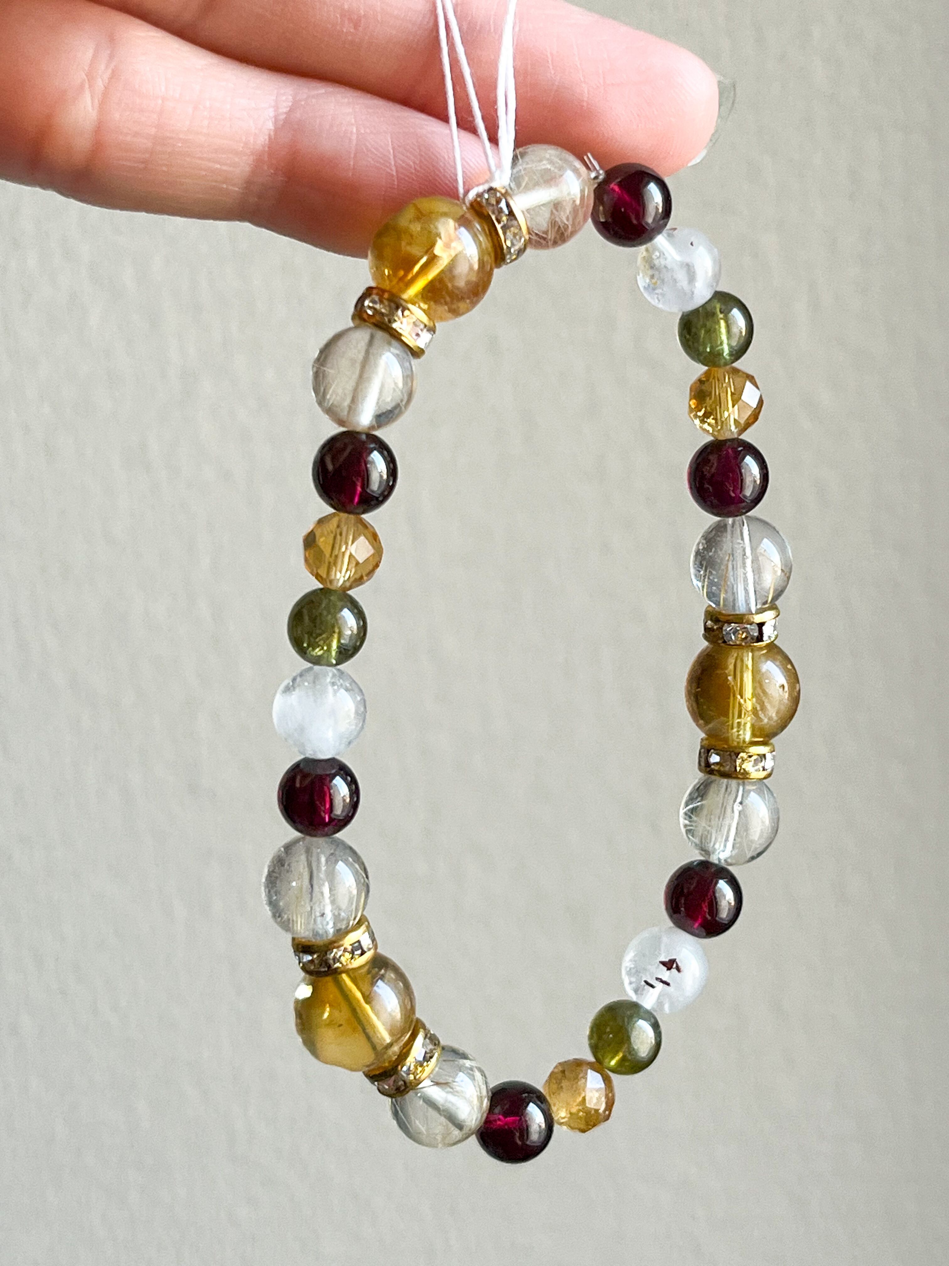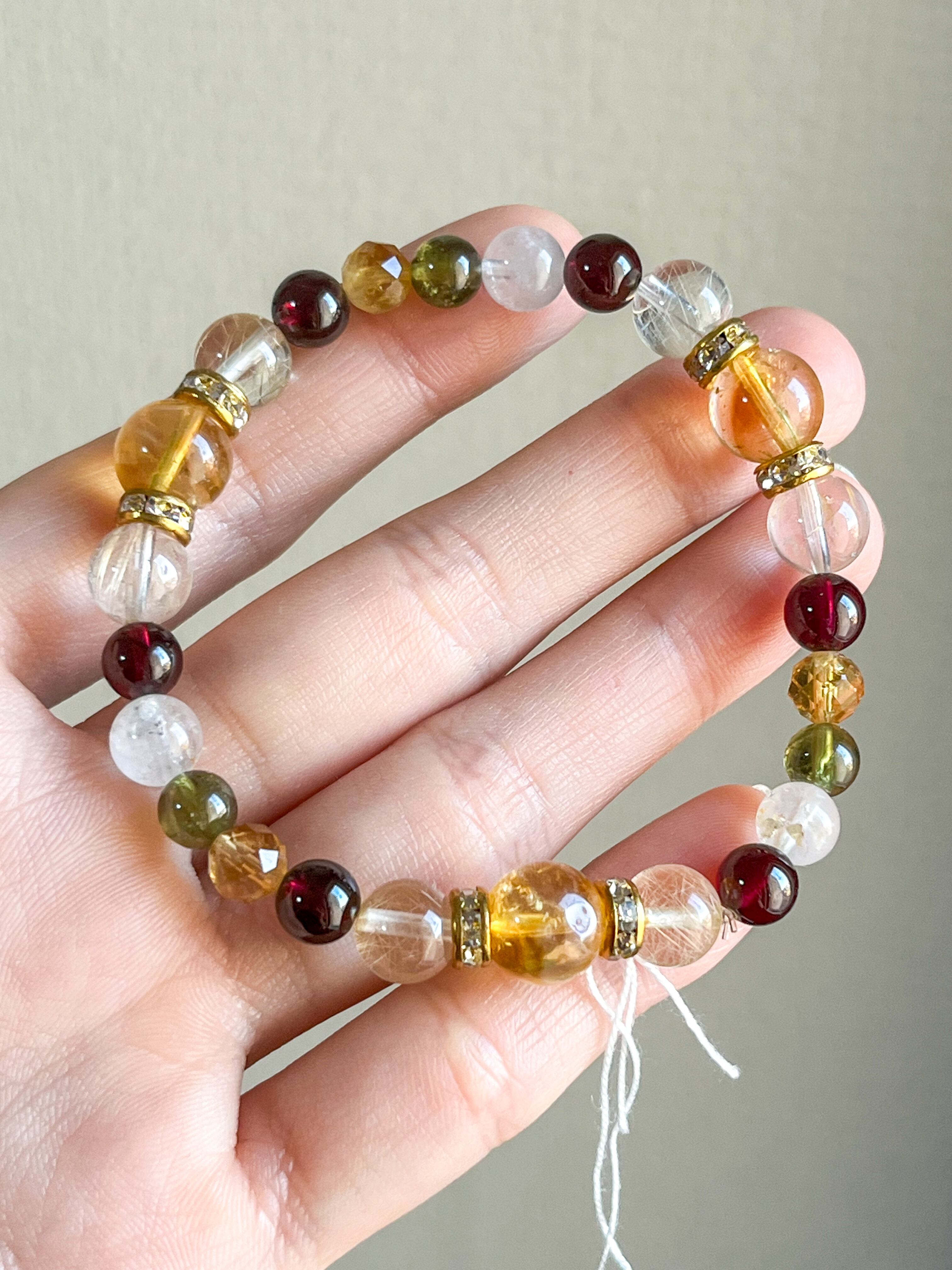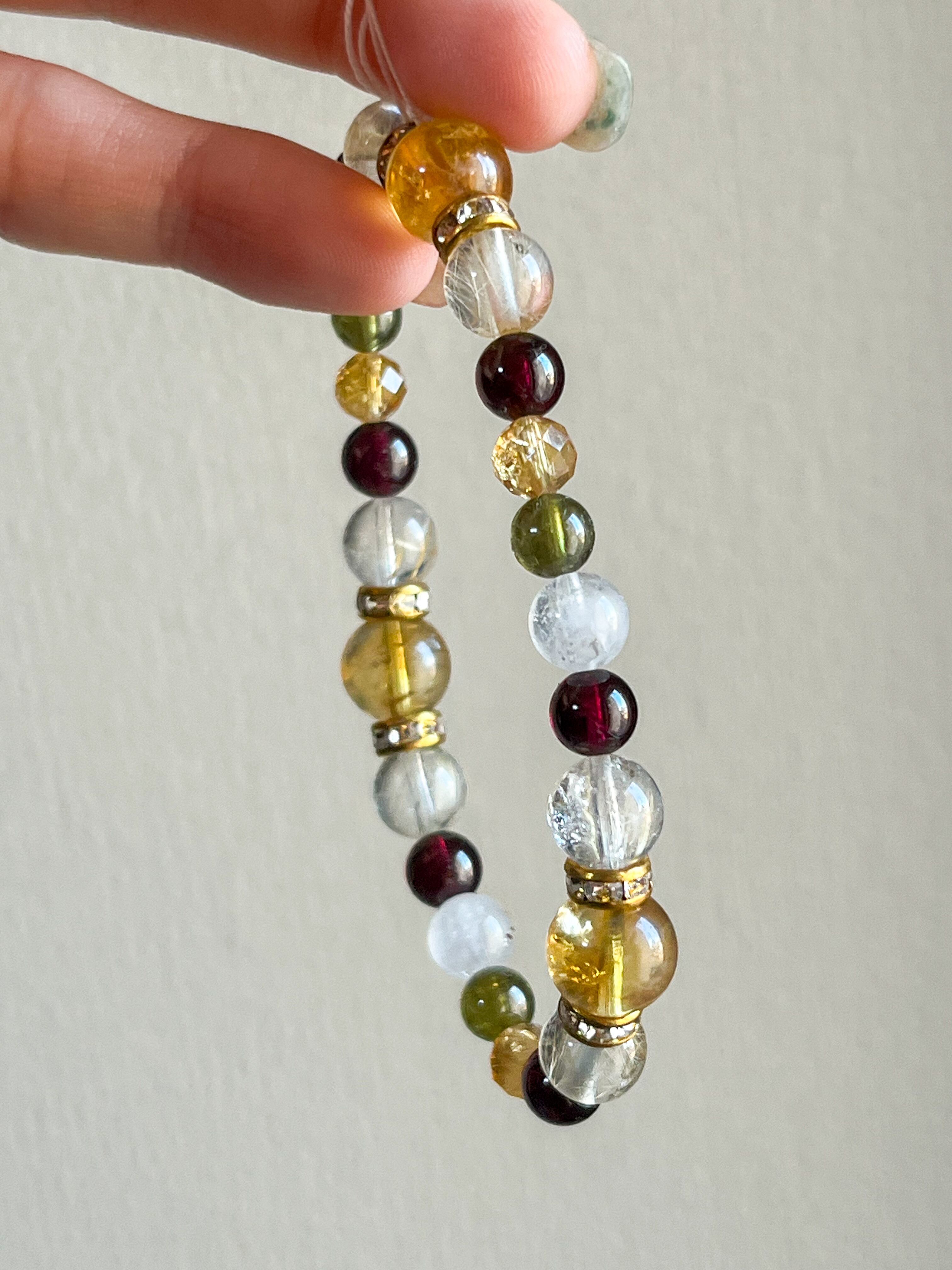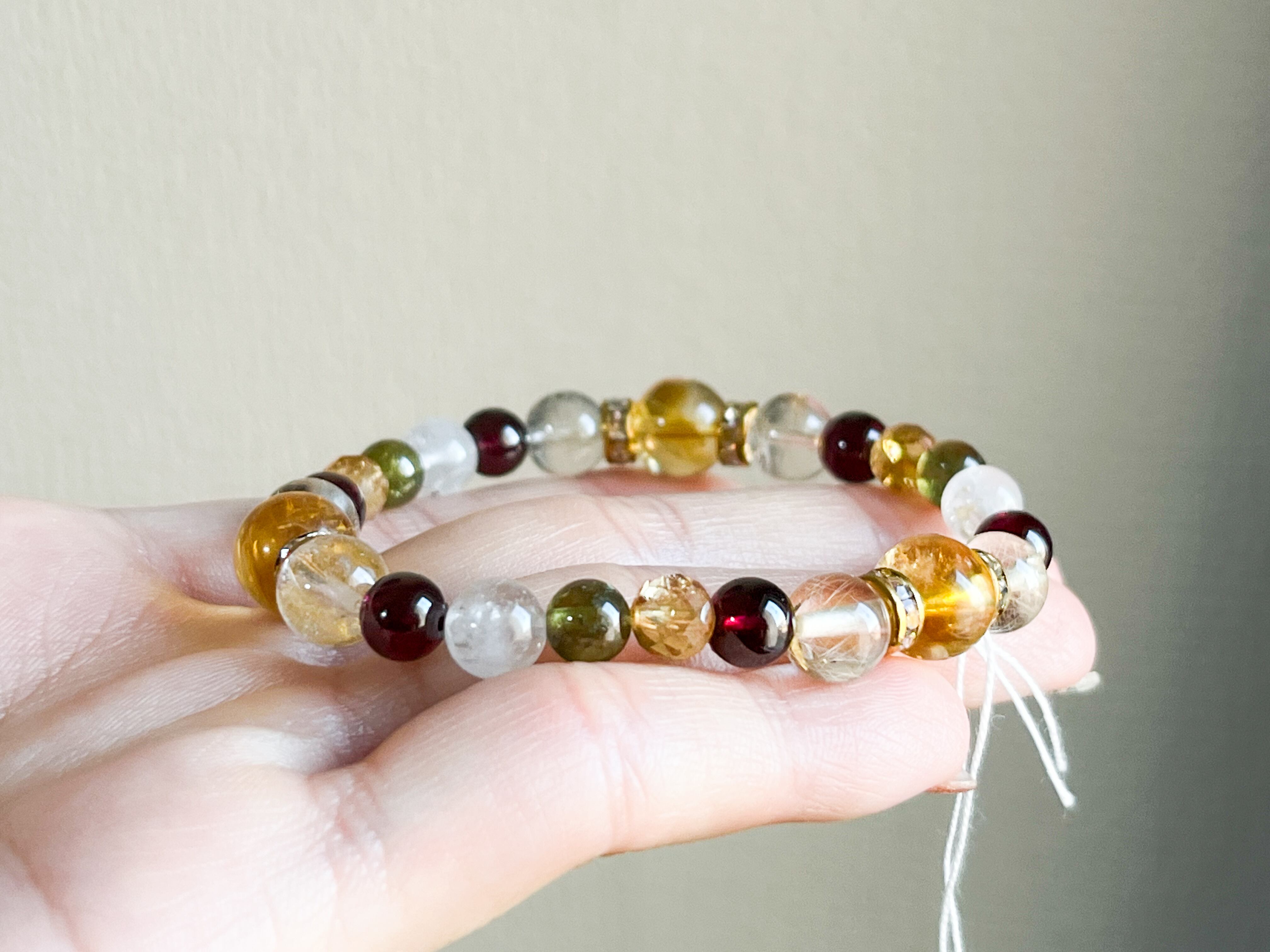 秋色の美しいストーンを組み合わせた高級感のあるブレスレットです。ガーネットは自信をもたらし、仕事や恋愛において地に足をつけて前に進むパワーを与えてくれます。シトリンはところどころに虹が見えます。可愛らしいイエローが気持ちを元気にしてくれます。