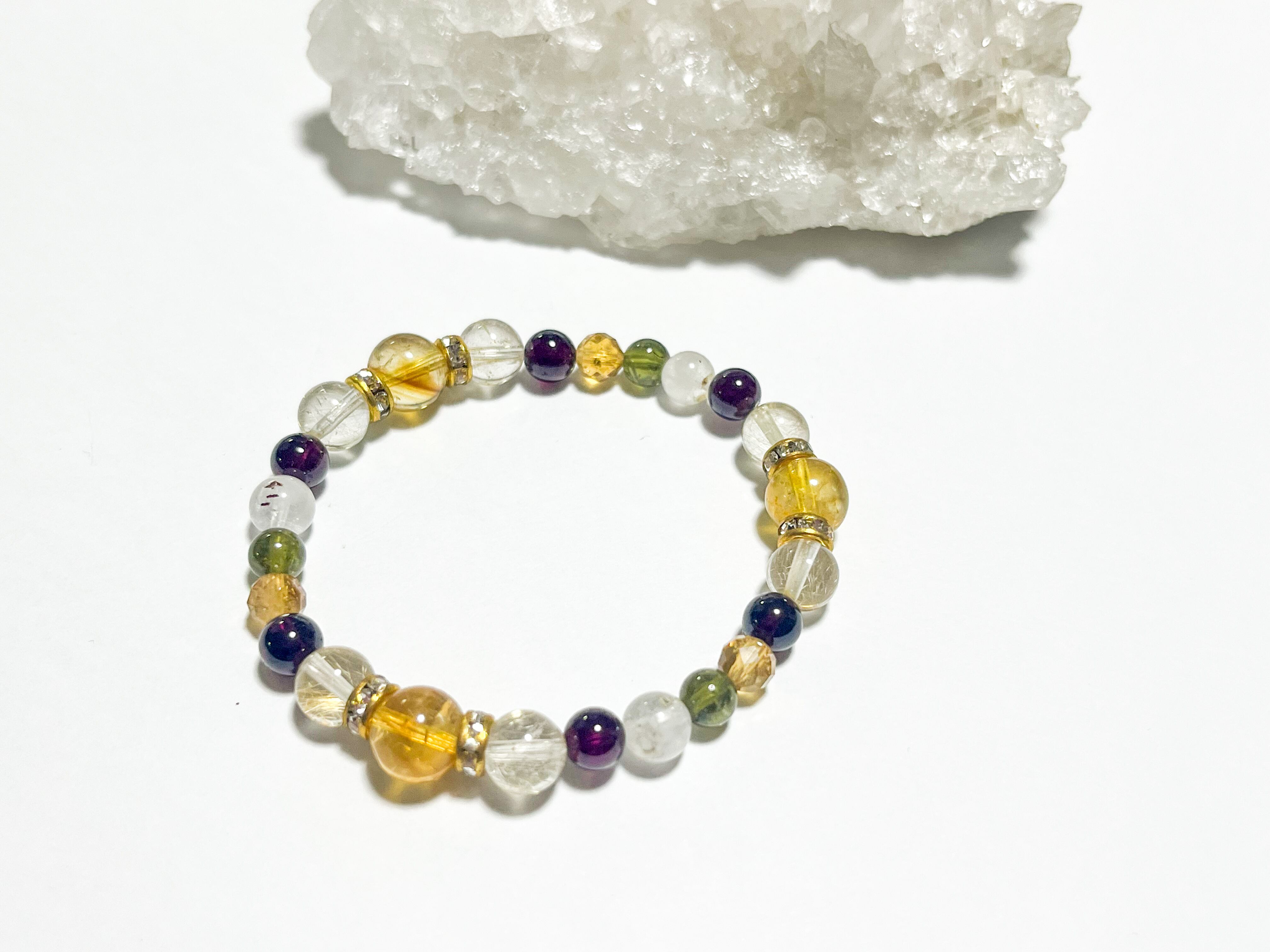 綺麗な透明感のあるルチルをシトリンの横に入れています。ルチルは金運アップもさることながら、デトックスや電磁波予防にも良いとも言われています。夏の疲れをデトックスさせて運気を向上させたい方におすすめのブレスです。