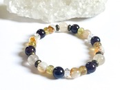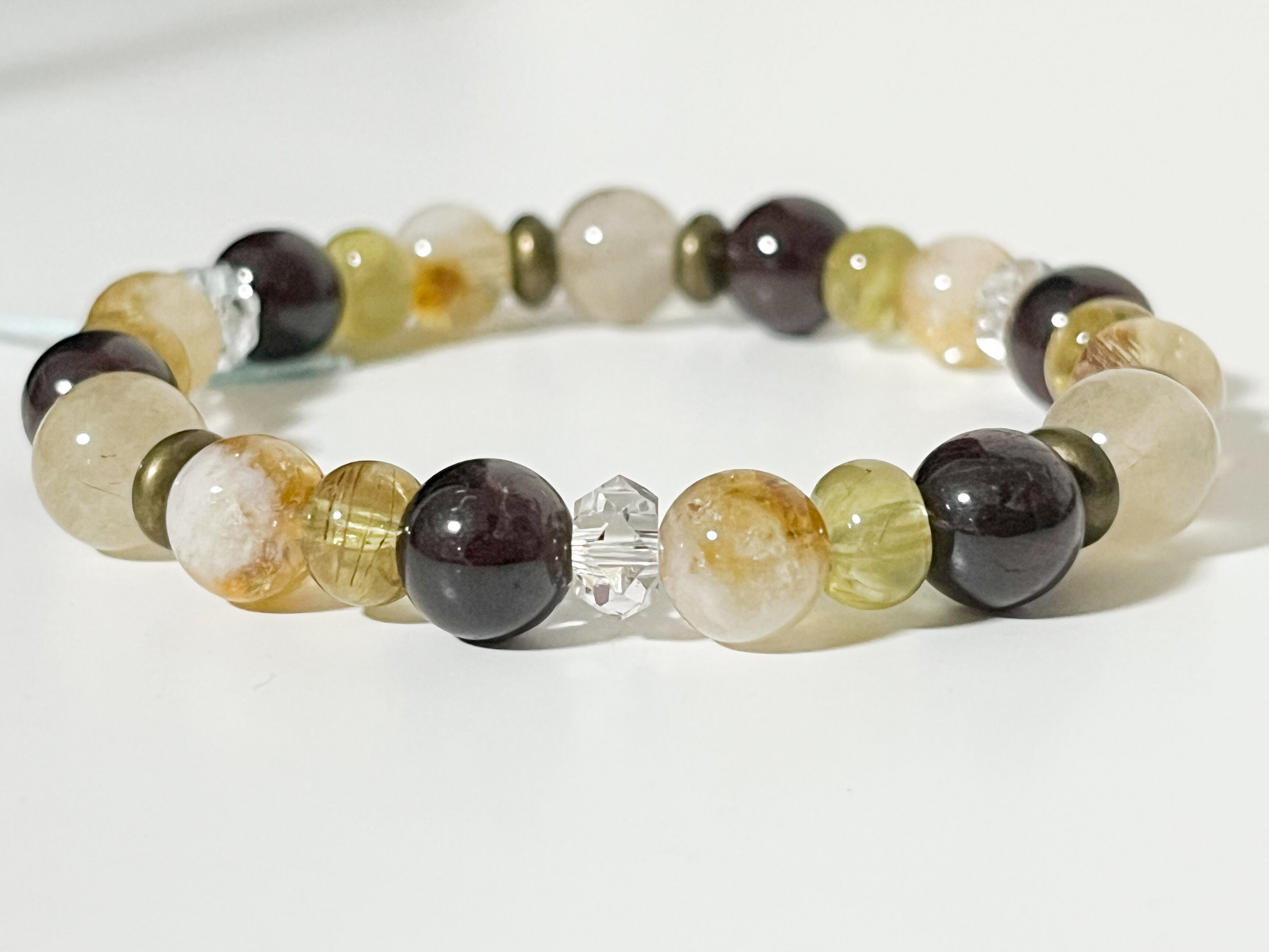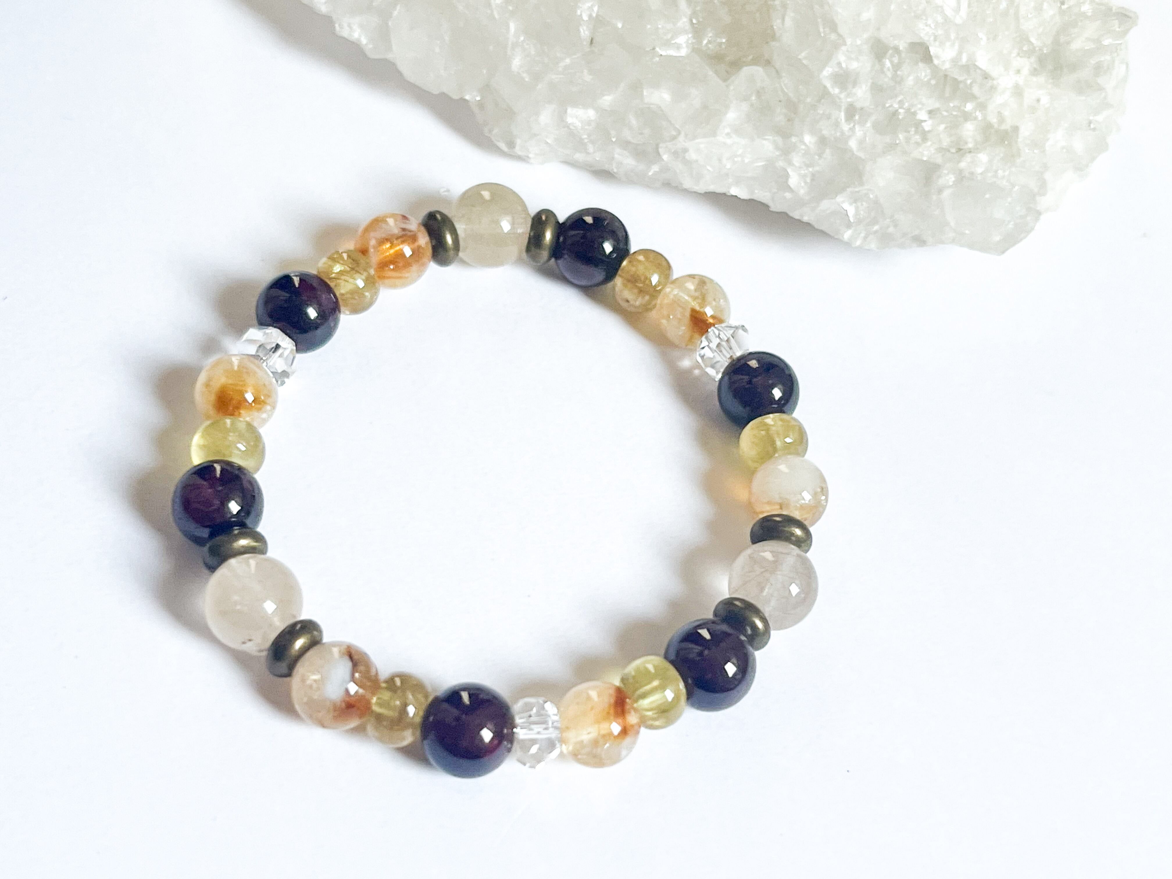 シトリンの明るい黄色、ガーネットの深い赤色、そしてゴールデンアパタイトの柔らかな金色が織りなす、豊かな色彩のコントラストが特徴です。優しい色合いのアンフィボールがブレスレット全体のオーラを柔らかくしています。