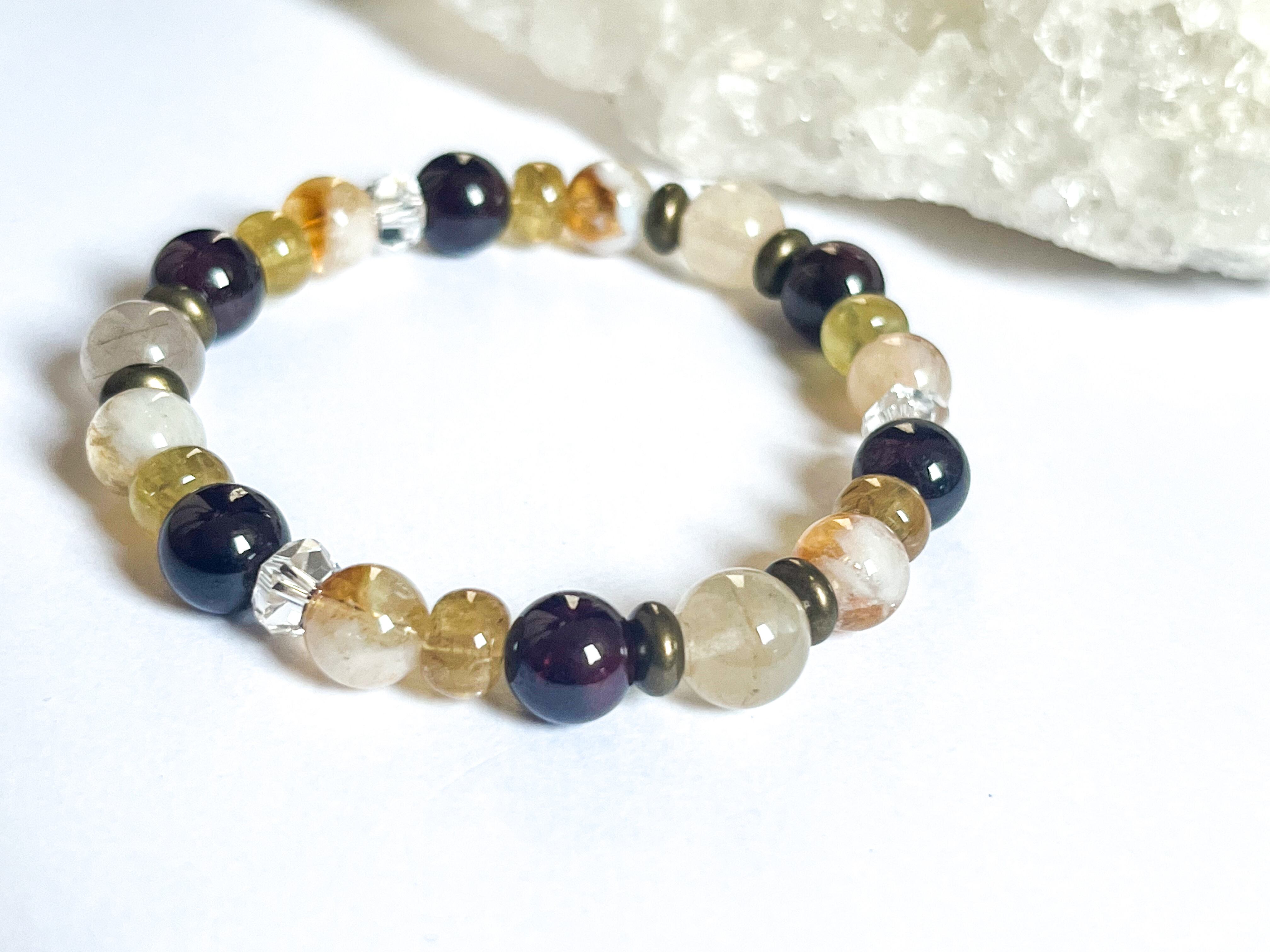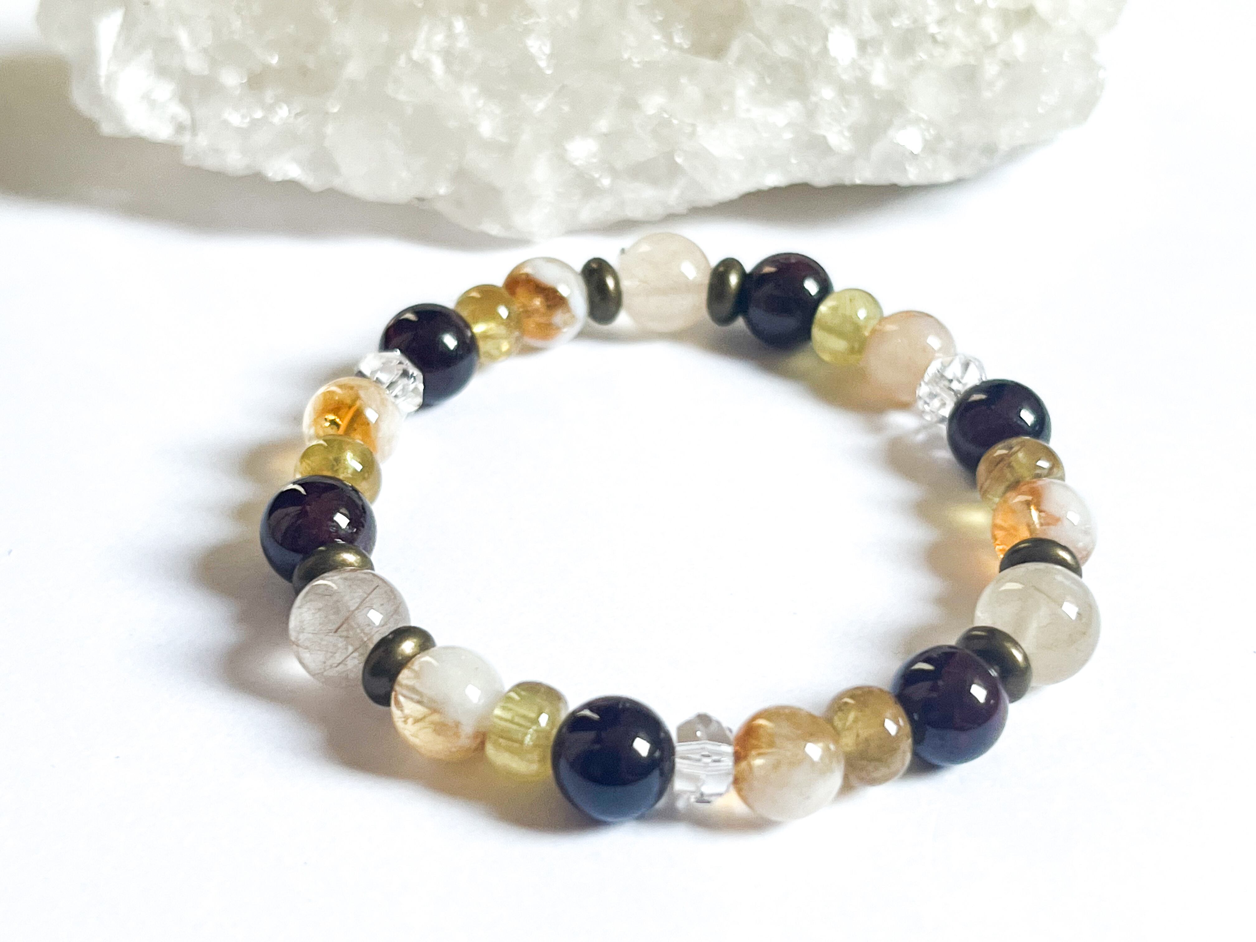 シトリンは、自己肯定感を高め、ひらめきや創造性を引き出すとされています。ガーネットはエネルギーを充填し、情熱や活力を呼び起こす効果があると言われています。一方、ゴールデンアパタイトはコミュニケーション力を高め、人間関係を円滑にする助けをします。このブレスレットは、心を豊かにし、色とりどりの夢を叶えたい方にぴったりのアイテムです!