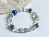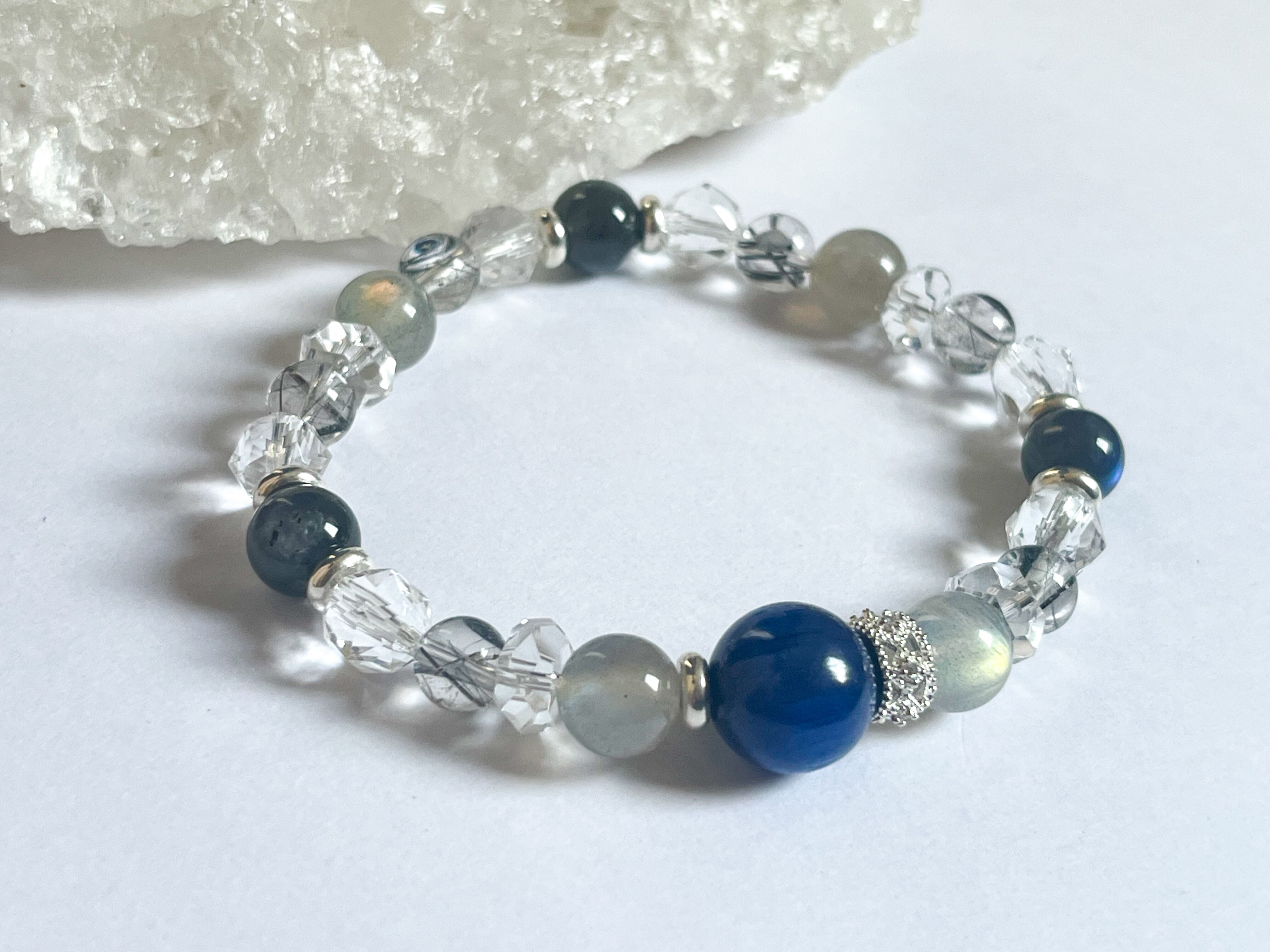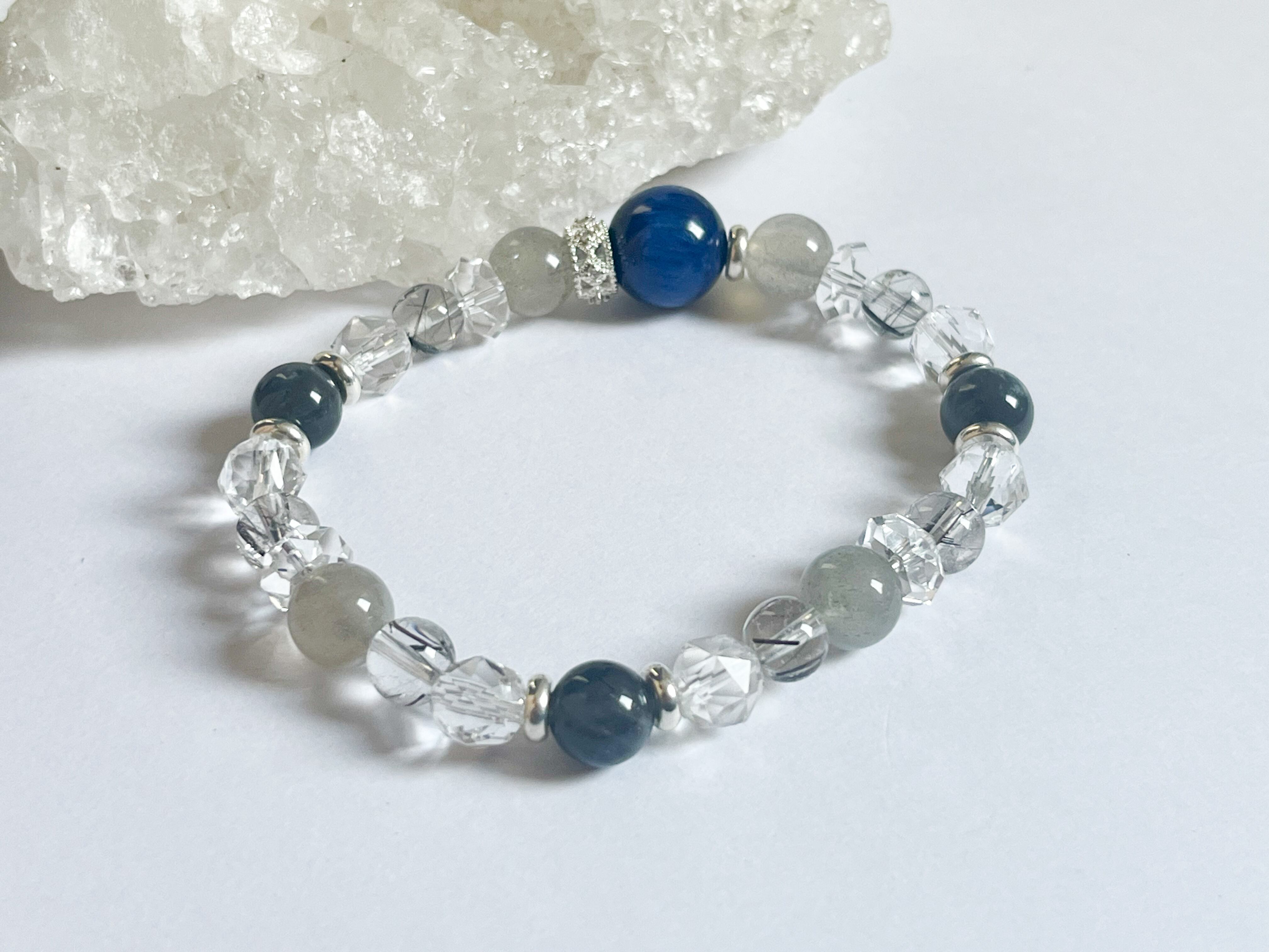 カイヤナイト、ブラックルチル、ラブラドライト、水晶を使用した、直感力を高めるエネルギーを感じるブレスレットです。カイヤナイトの深い青色、ラブラドライトの神秘的な輝き、ブラックルチルの独特な表情が織りなす、モダンで洗練された印象が特徴です。