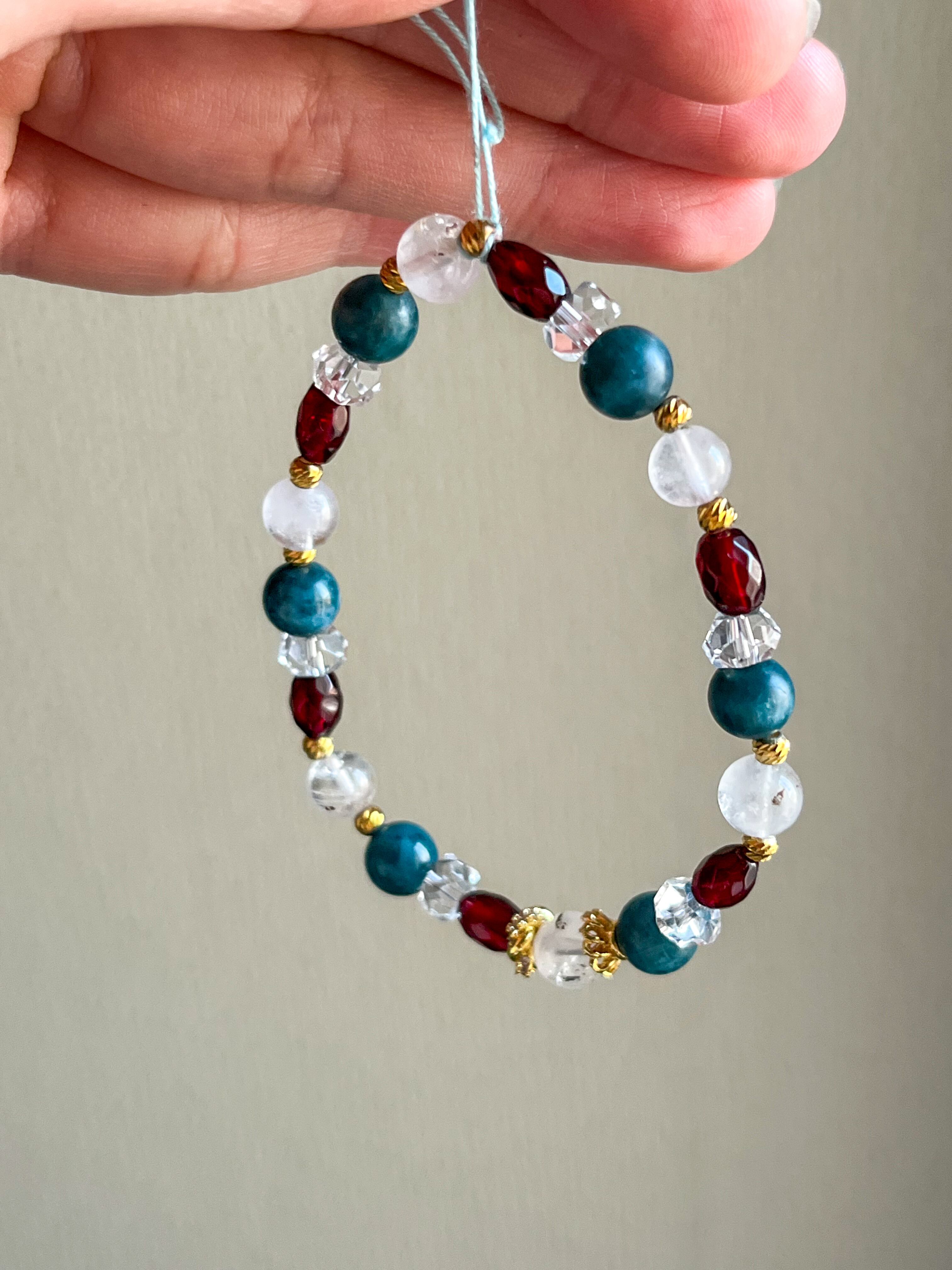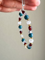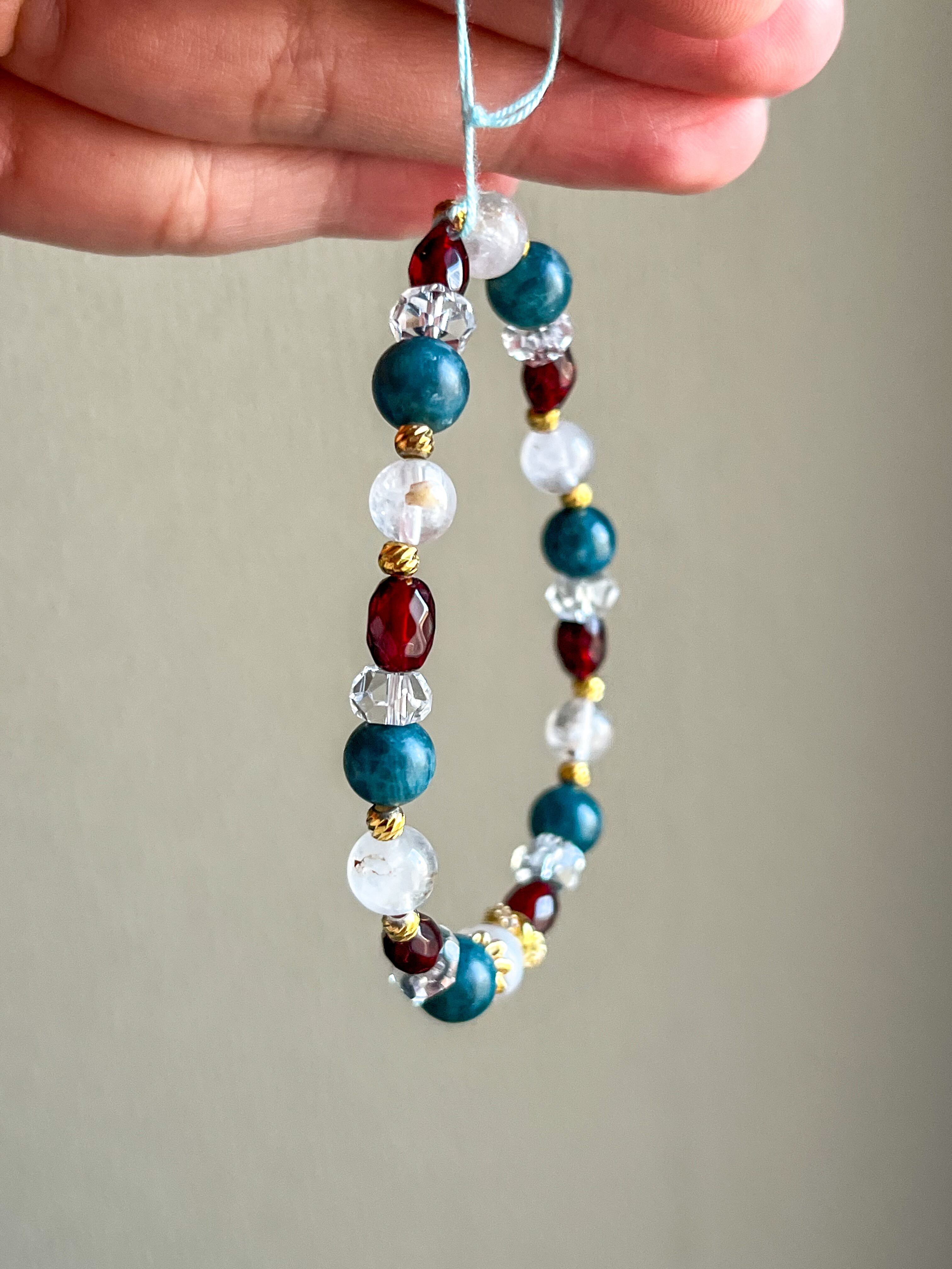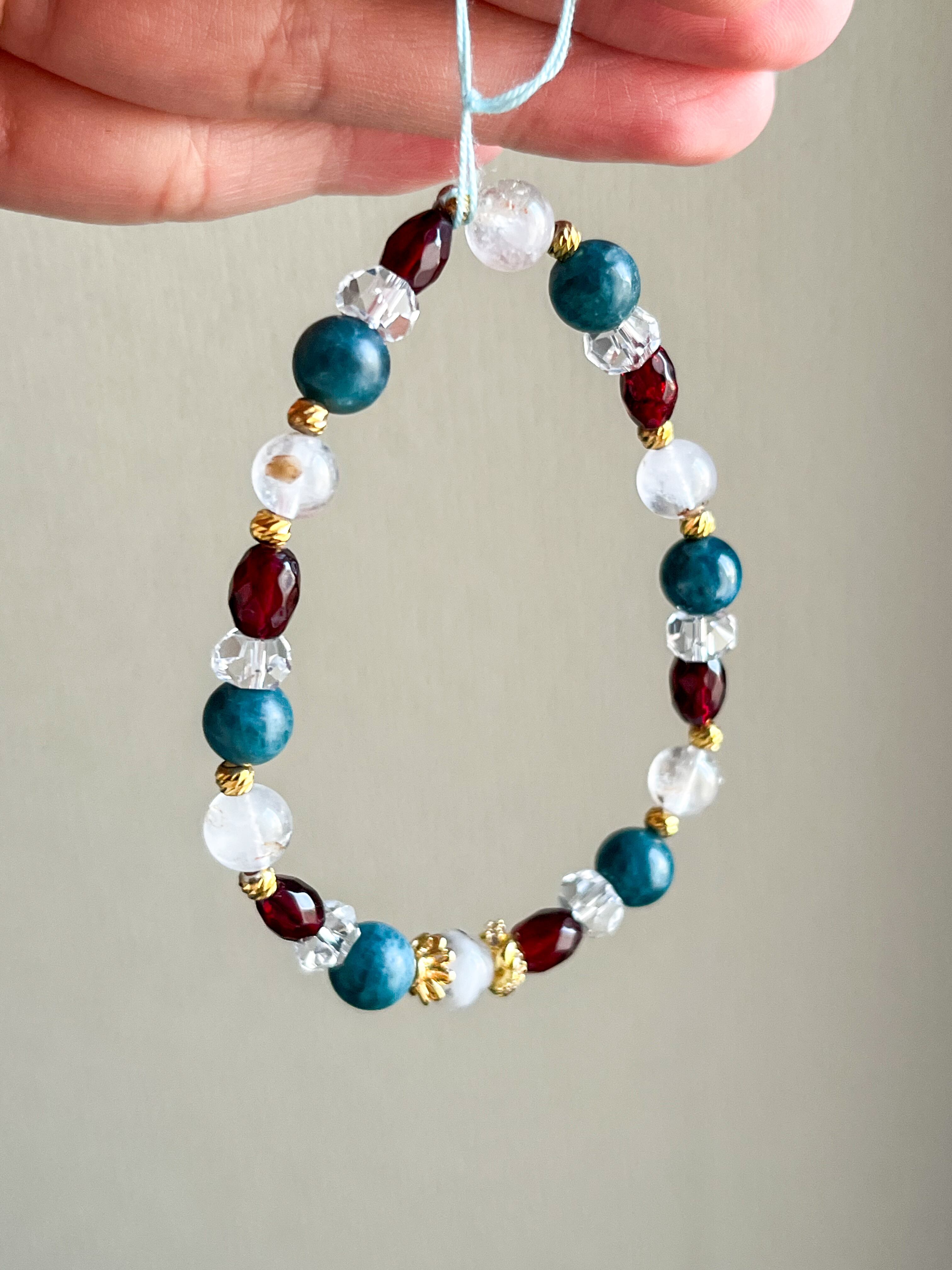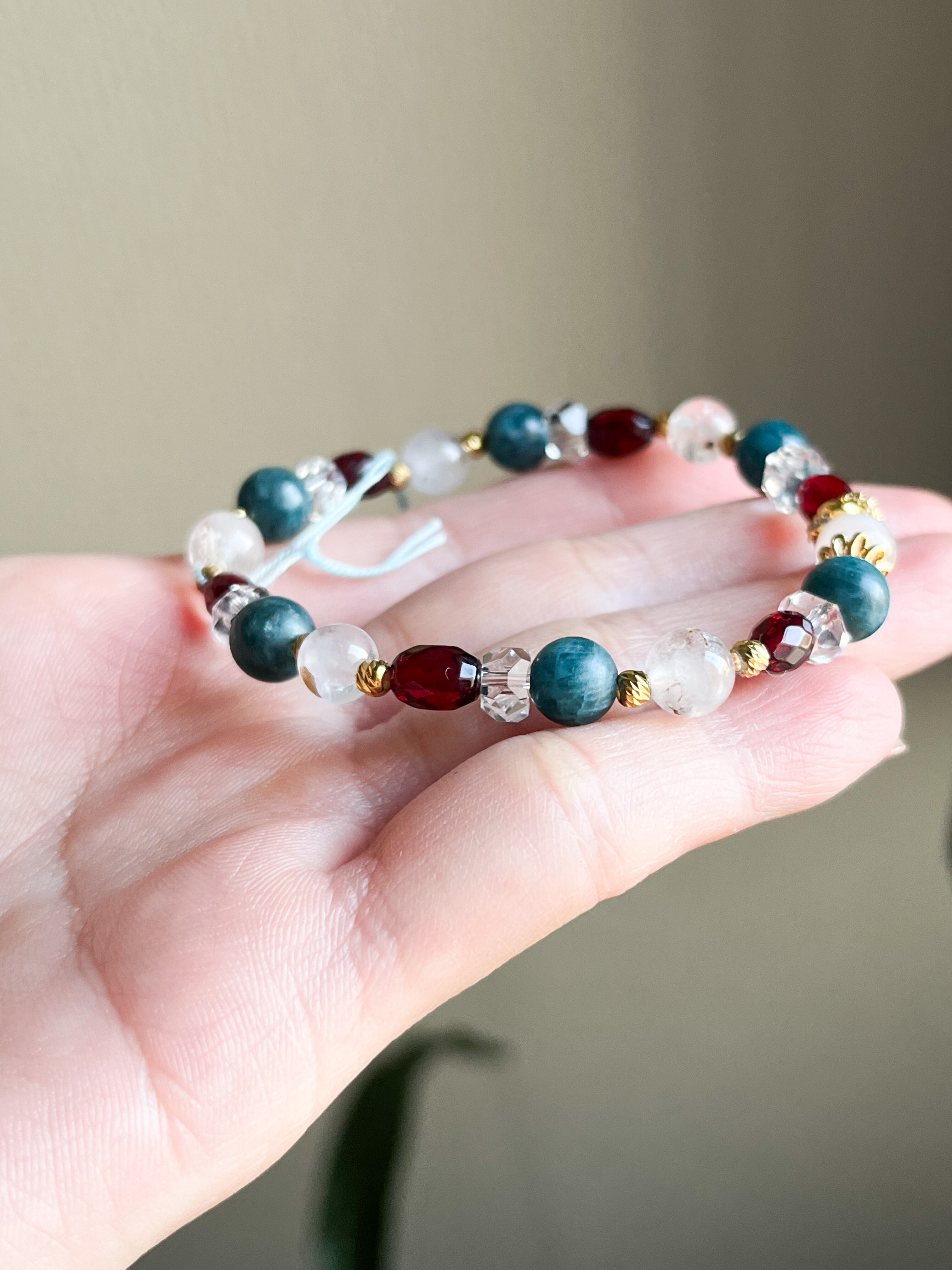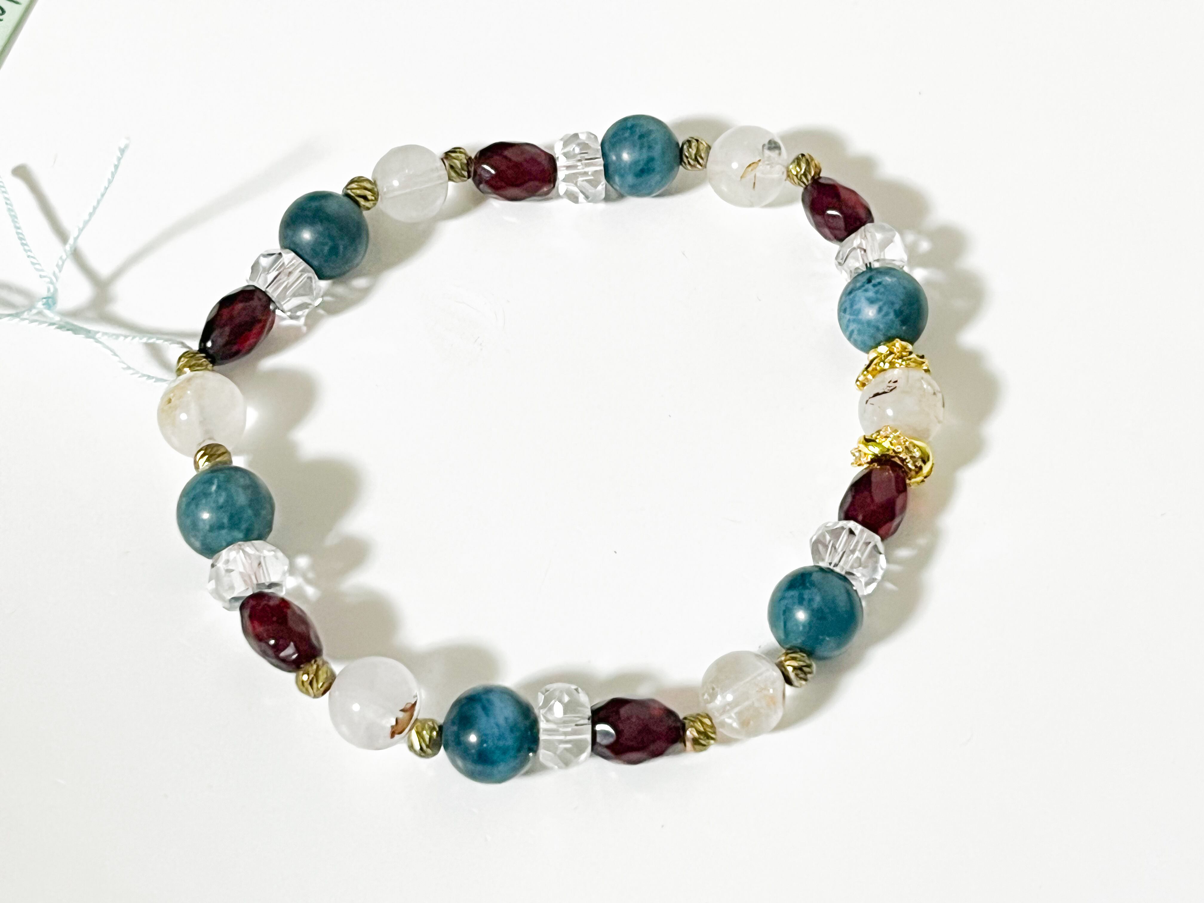 レッドアンバー、ブルーグリーンアパタイト、オイルインクォーツを使用した、大人の洗練を感じるブレスレットです。