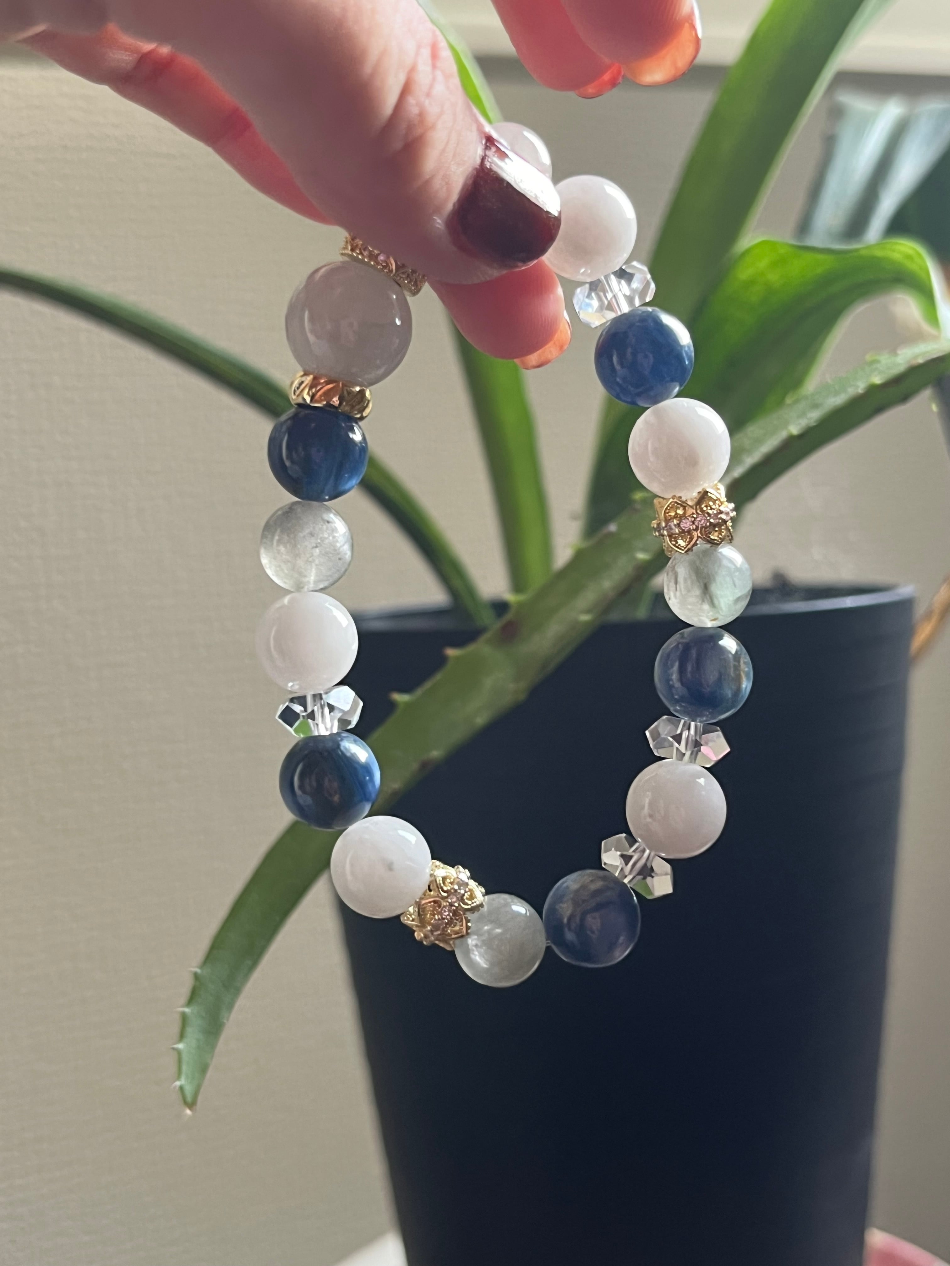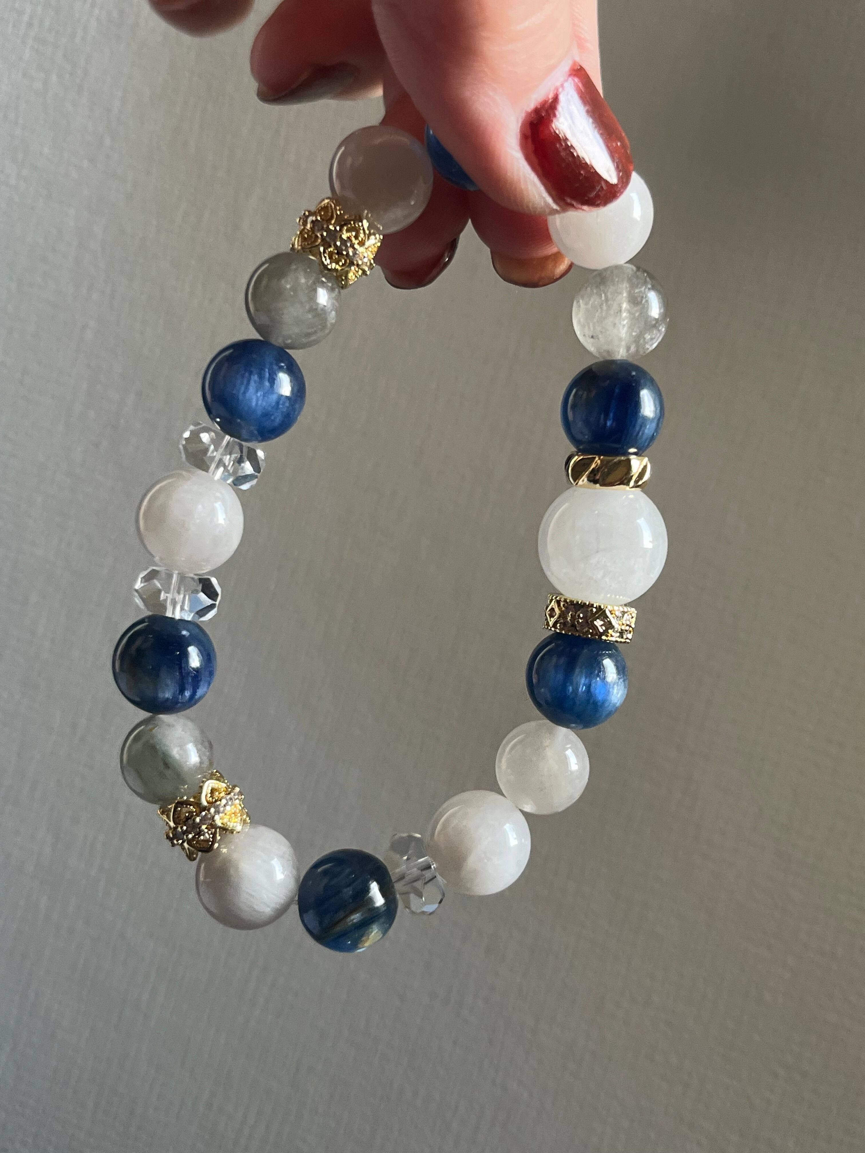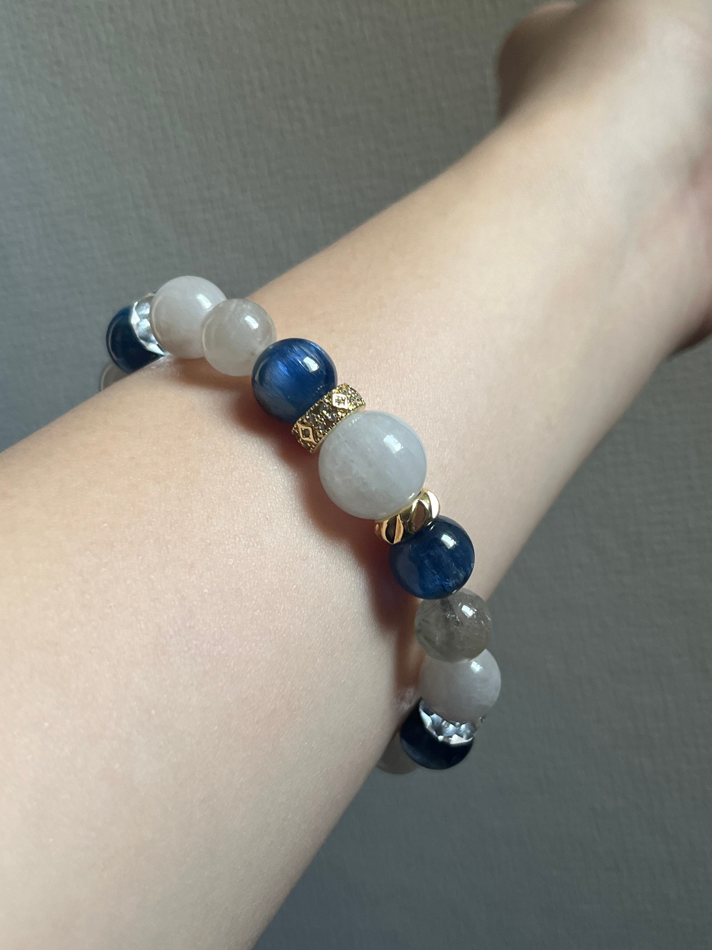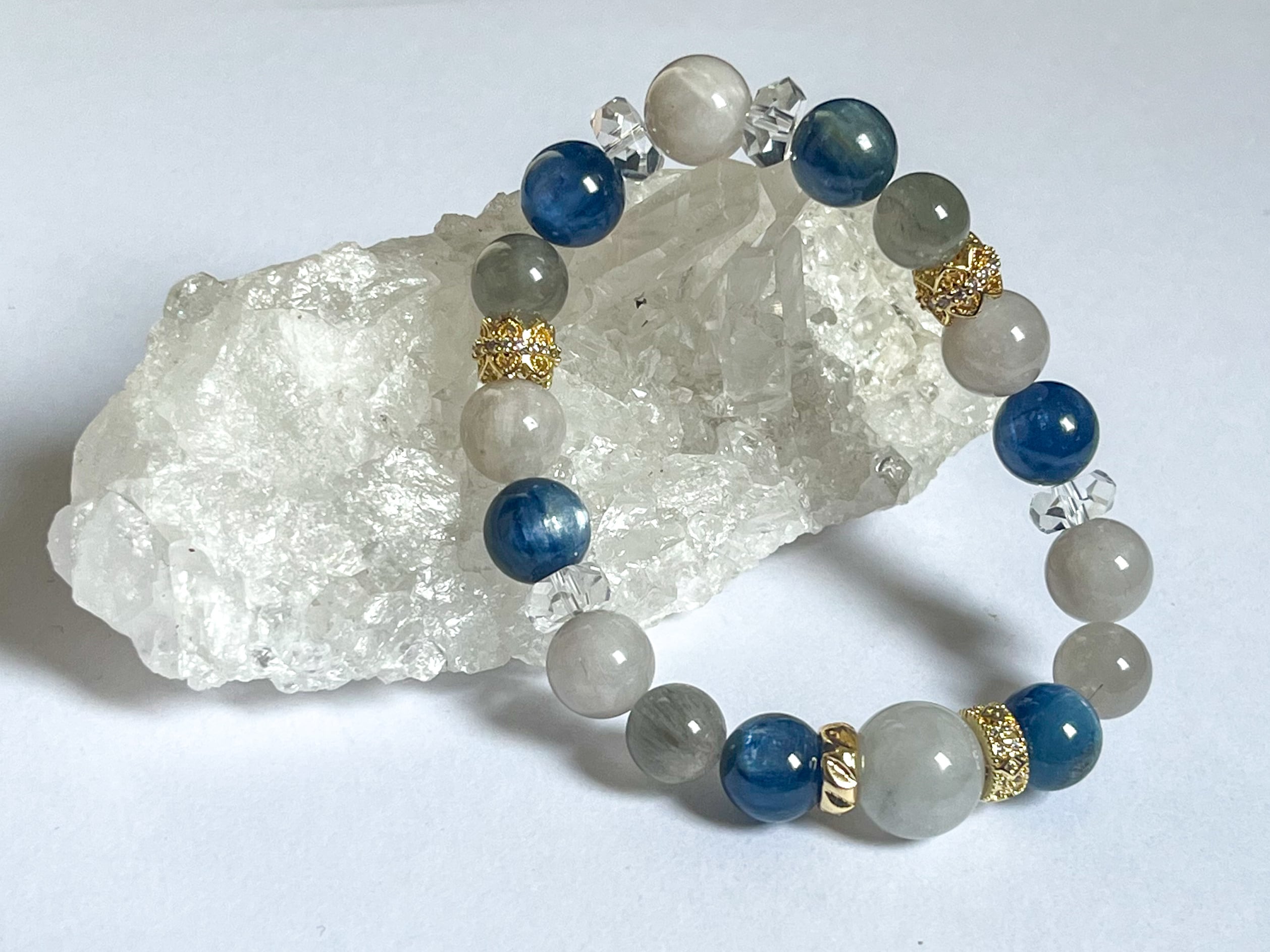 深い青色のカイヤナイトと、ホワイトルチル、ブルールチルの組み合わせは、視覚的にも心を惹きつける魅力があります。この華やかなデザインが、あなたの個性を一層引き立ててくれるでしょう。