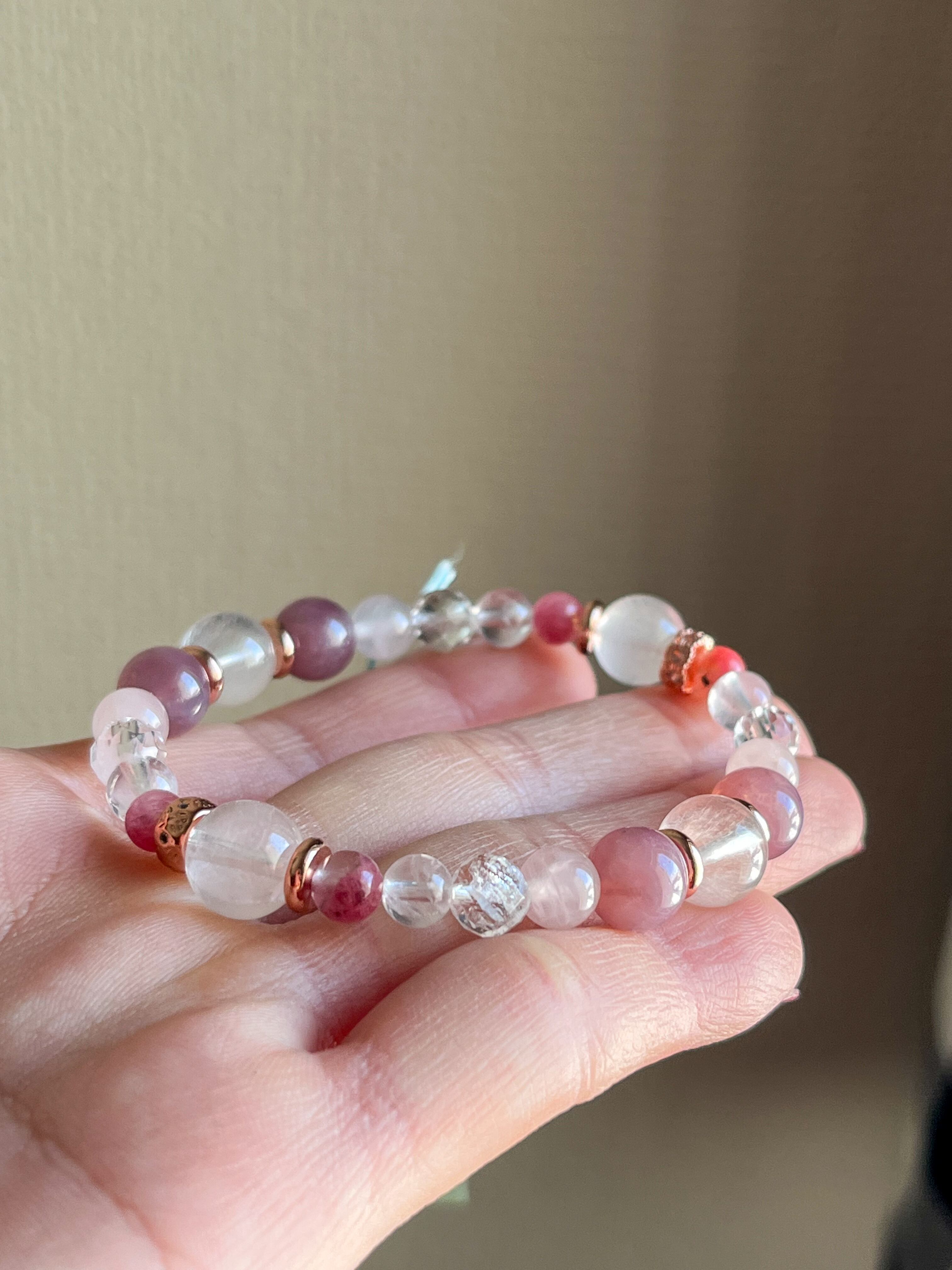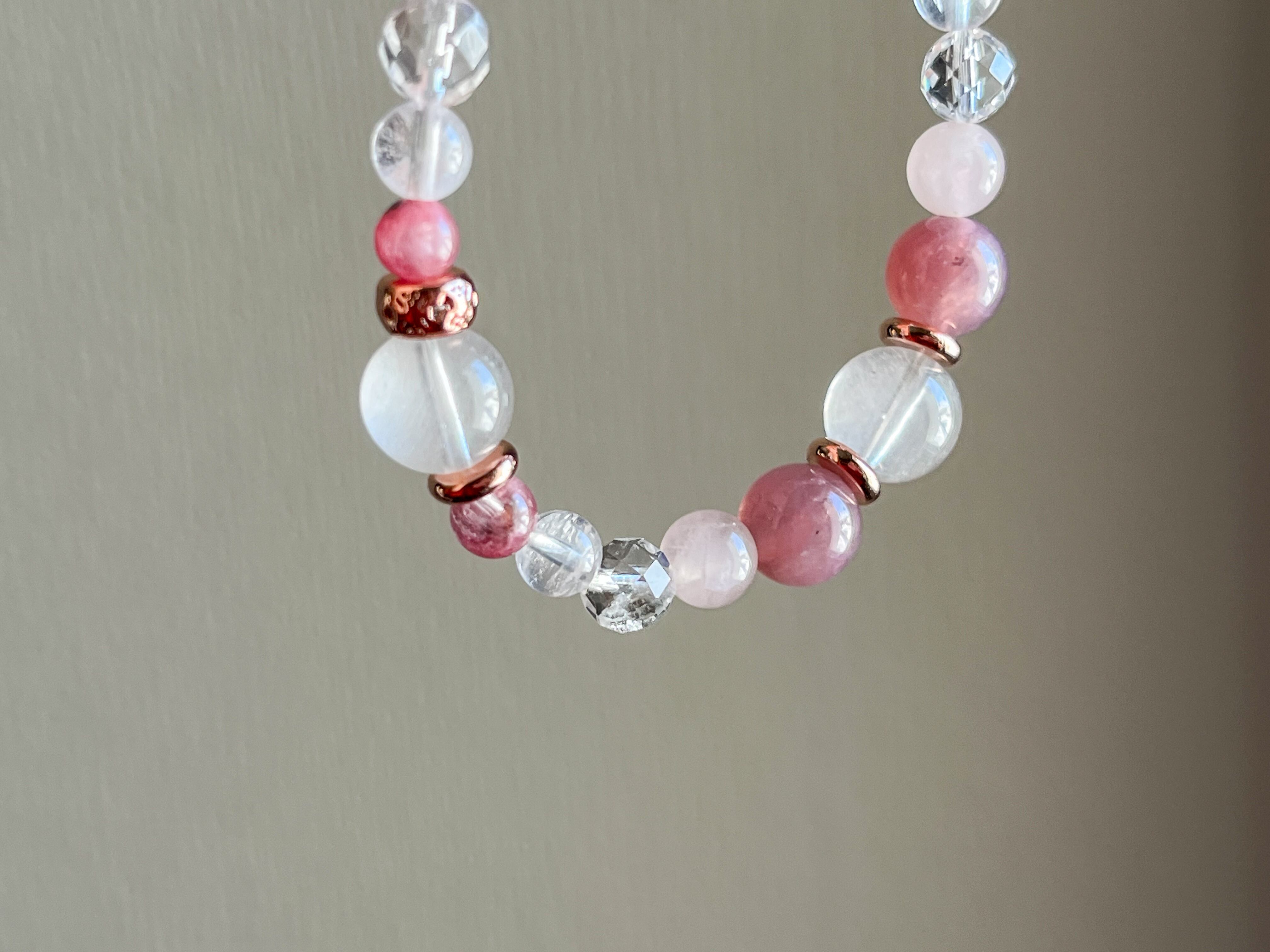 このブレスレットは、爽やかで可愛らしいピンクの色合いが魅力のロードナイトシリカ、柔らかなローズクォーツ、そして魅力的なラズベリークォーツを贅沢に使用したアイテムです。それぞれの天然石が見事に調和し、おしゃれでありながら女性らしい印象を与えます。日常使いから特別なシーンまで、華やかさを添える存在感を持っています。