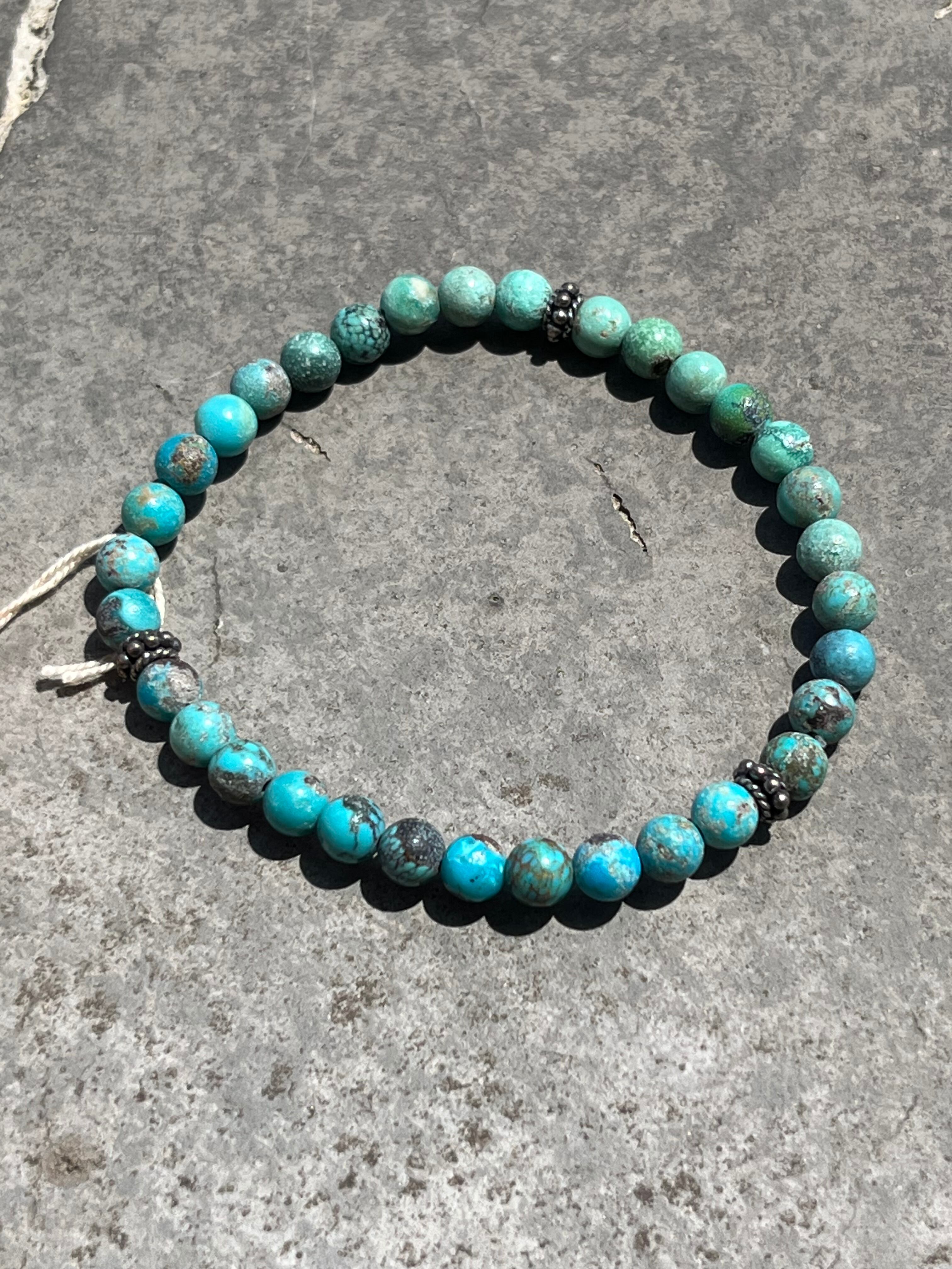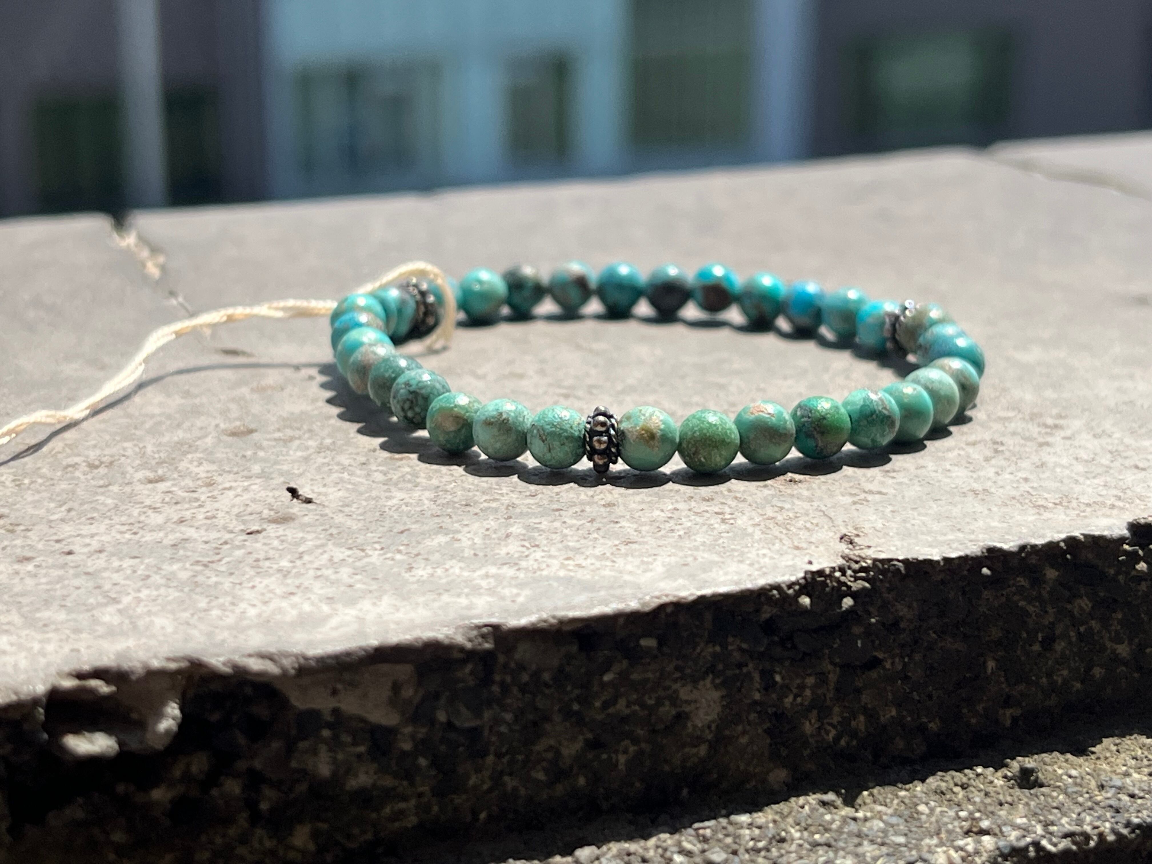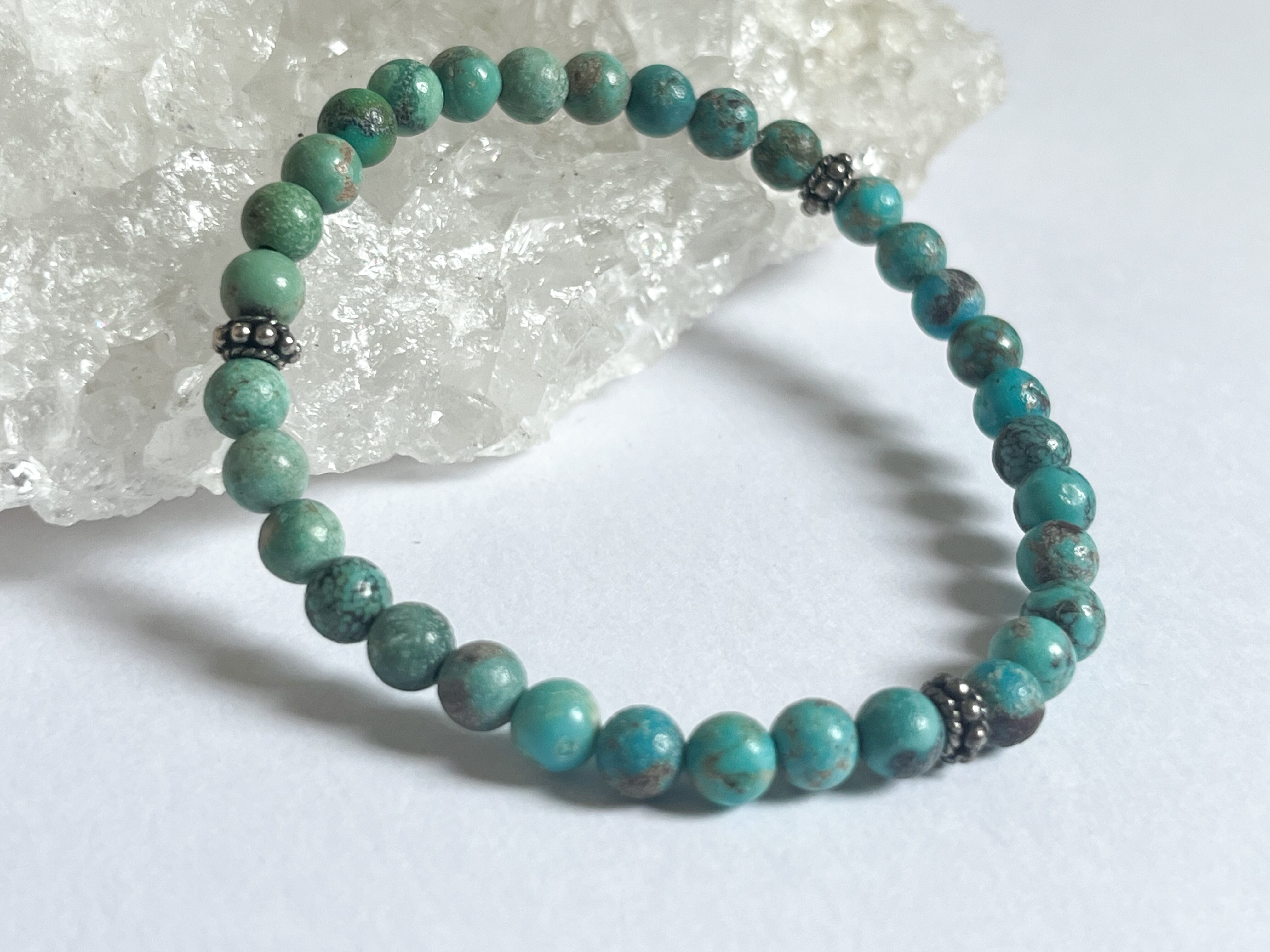 このブレスレットは、鮮やかなターコイズを贅沢に使用した魅力的なアイテムです。青緑色のターコイズは、自然の美しさを持ち、見る人を惹きつけます。シンプルでありながら存在感があり、日常のコーディネートはもちろん、特別な場面でも華やかさを添えます。