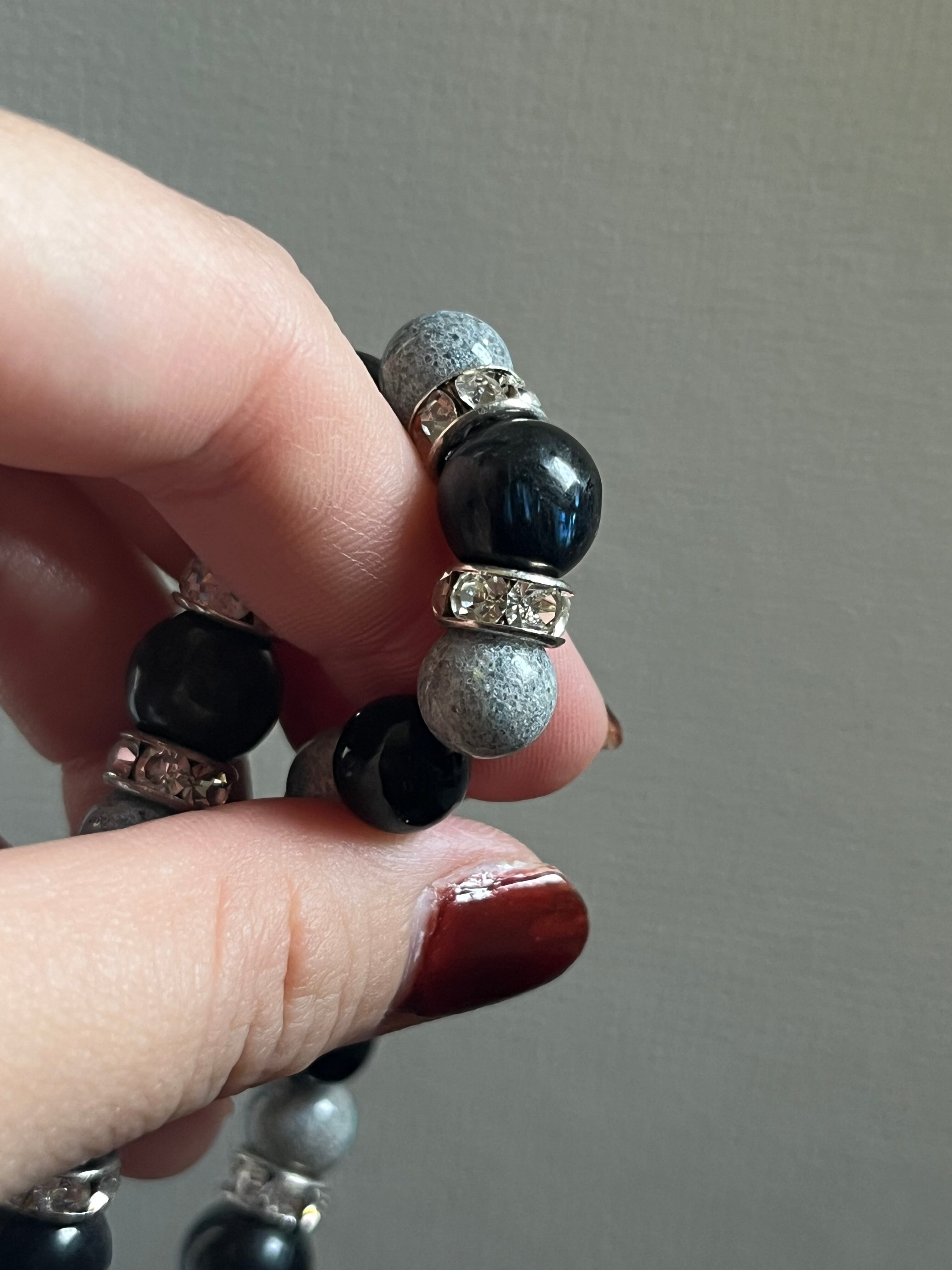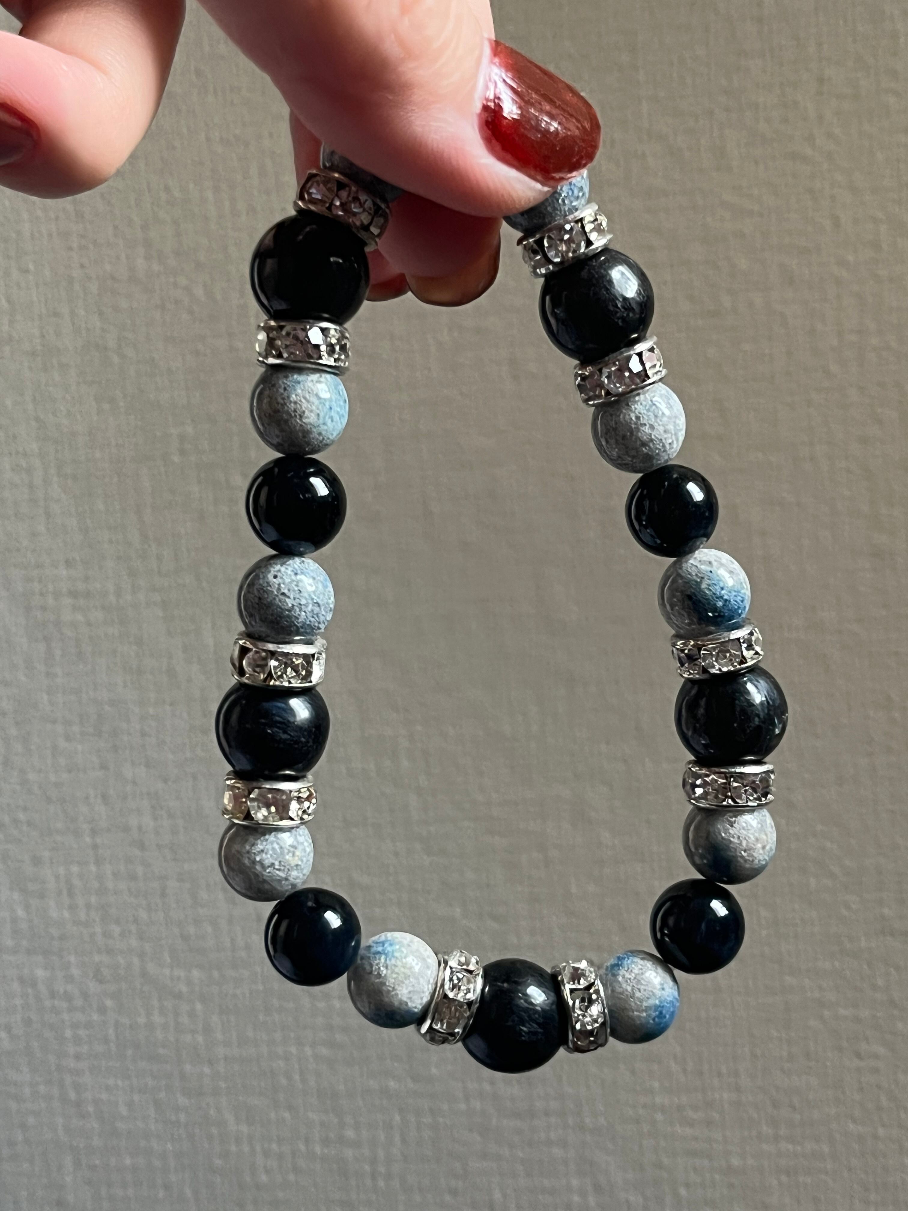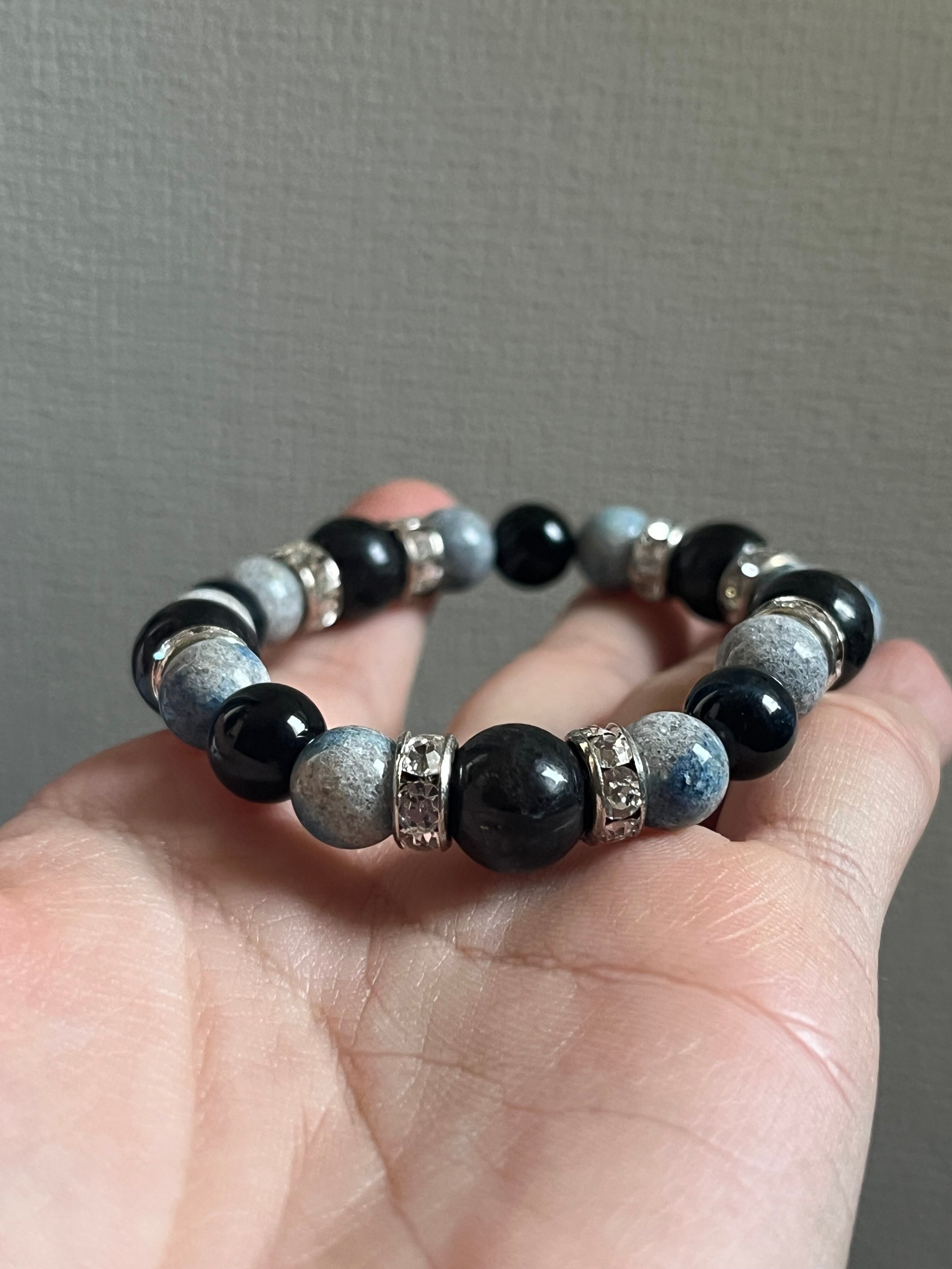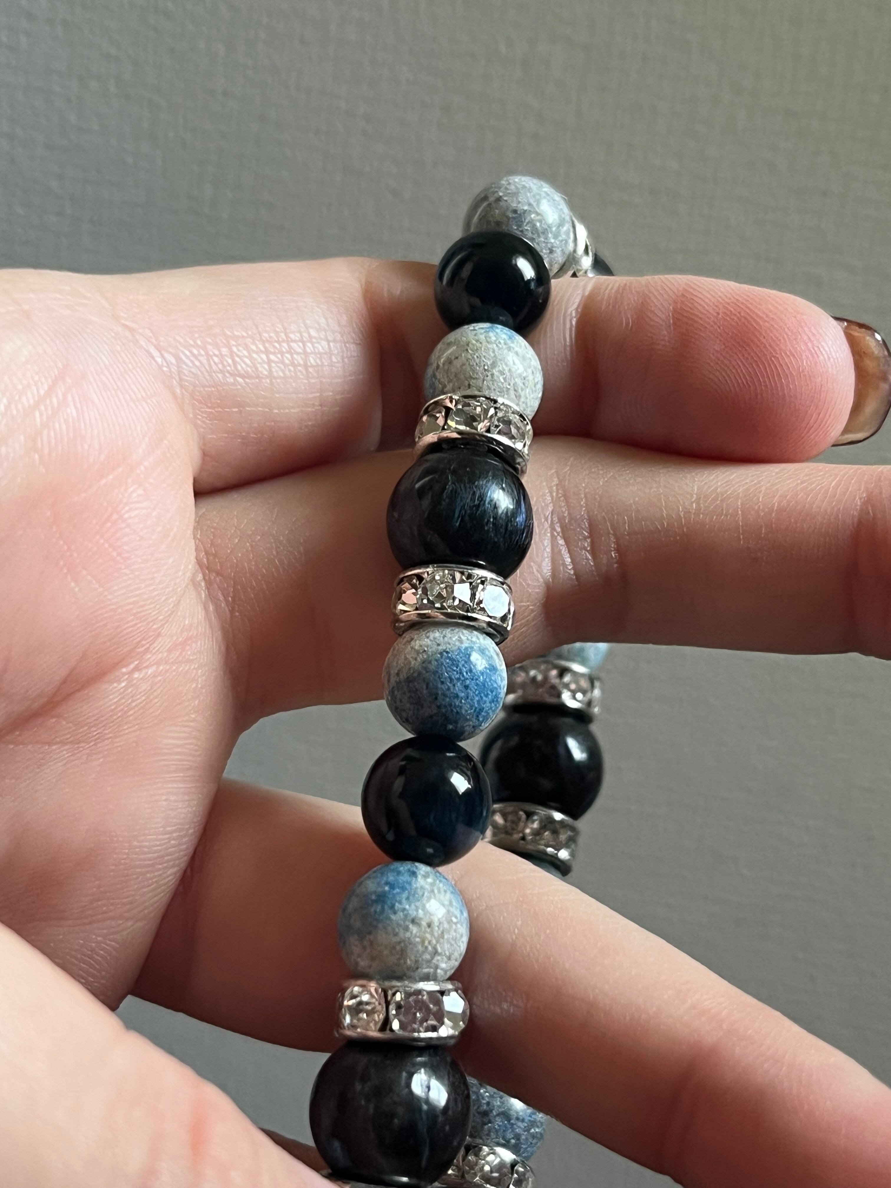 このブレスレットは、神秘的なK2ストーンとヌーマイトを贅沢に使用した魅力的なアイテムです。K2ストーンはそのユニークな模様と深い青色が特徴で、見る人を惹きつける美しさを持っています。行動力や直感力を高める力もあります。ヌーマイトは独特なブルーの輝きを持ち、心に安らぎをもたらす効果があります。ブルータイガーアイを加えることでシックながらも魔除けと強さを感じられるブレスレットになりました。内面的な安定や新たな始まりを求める方に最適なブレスレットです。
